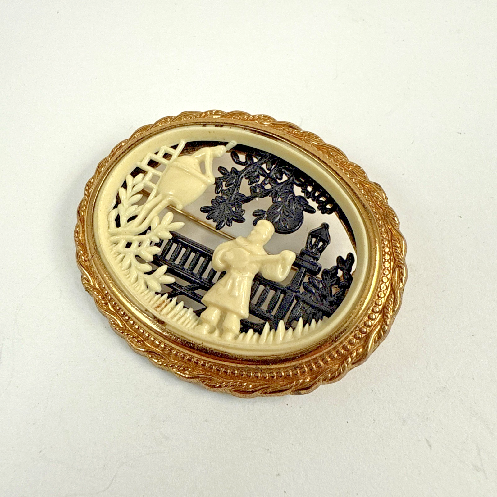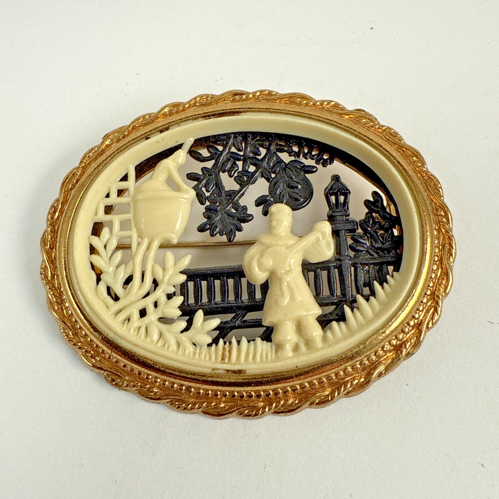 Vintage CORO Pegasus Hallmark Romeo & Juliet Celluloid Oval Gold Tone Brooch. Pre-Owned Estate Jewelry in Very Good Condition. Ready to wear, give as gift or add to a collection. Our Vintage items are mostly from estate sales and vary in age from 100+ years old to more modern pieces. Please use your judgement. Items are photographed on a measuring matte with one-inch squares to give you an idea of size. Any photography props / holders you see are not included.