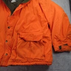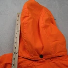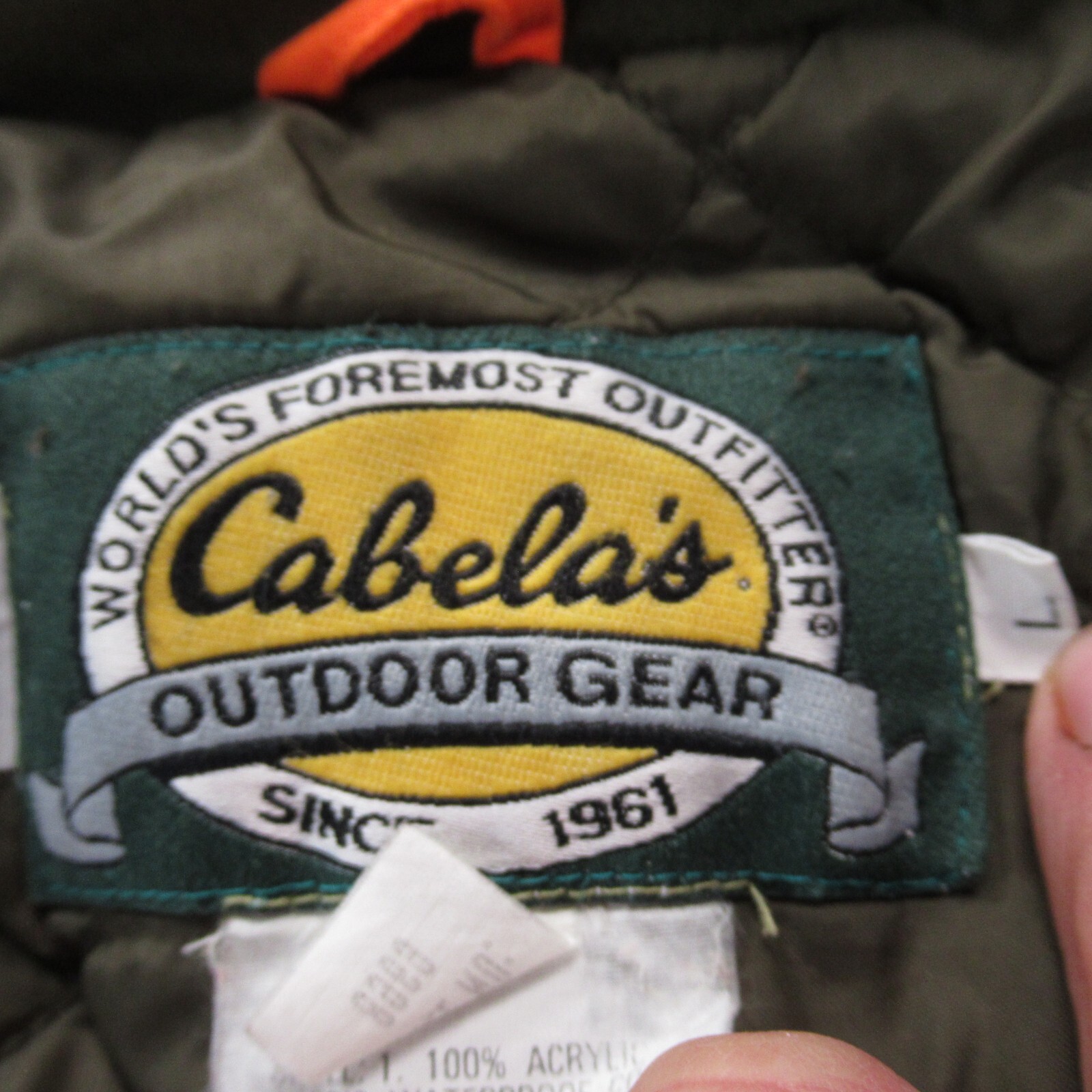 This item has a few blemishes, no tears no rips as pictured. See photos for measurements. Removable Hood This is a Cabela's men's jacket in size L, featuring an orange acrylic outer shell with a removable hood. It is waterproof and insulated, suitable for outdoor activities like hunting, hiking, and walking. The jacket has a mid-length design with a full zip closure, snap accents, and multiple pockets. Description may be generated by AI. · Ships within 24 hours · Free 30 Day Returns · Contact us via message for prompt resolution with any issue