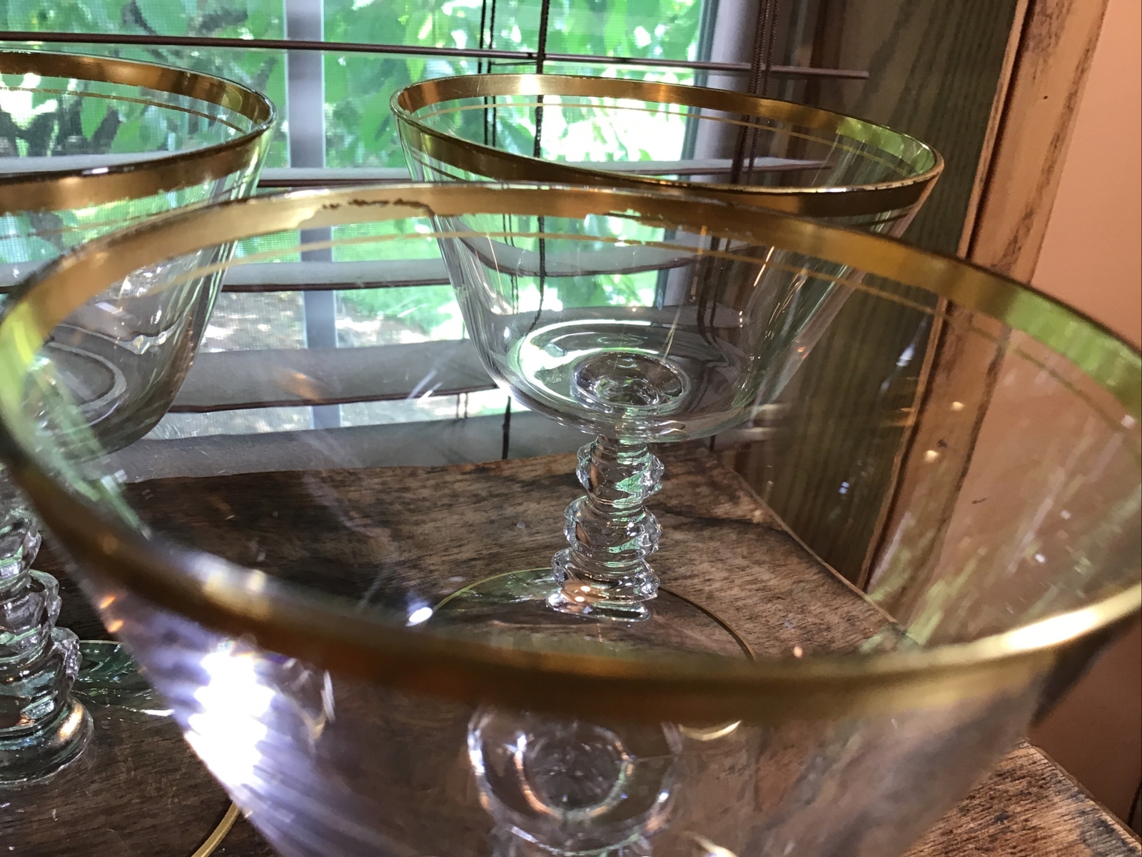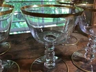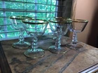 5 vintage Cambridge Wedding Band 6 oz champagne tall sherbert glasses. 4 7/8” tall. Double gold band. 3 cube stem. Some expected wear on gold. No chips or cracks. Gold rim on base.