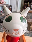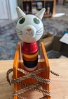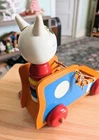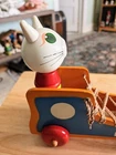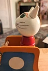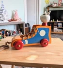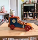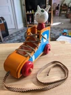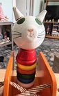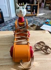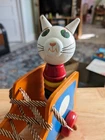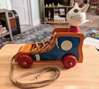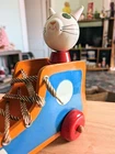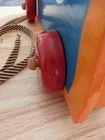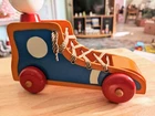 Toy has some issues from use. Including a notch on the cats ear and paint scratches on wheel. I included close up photos. Toy is 10 2/8" long and 8 5/8" high. It has a string and rolls when pulled. The lace comes unlaced and can be relaced in order to teach shoe tying. The cats head is removable and the wooden rings come off and can be played with as well as used to teach colors. It's very well made and sturdy. It will hold up well when played with. It's built to last through generations of play