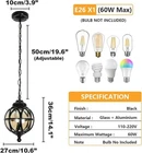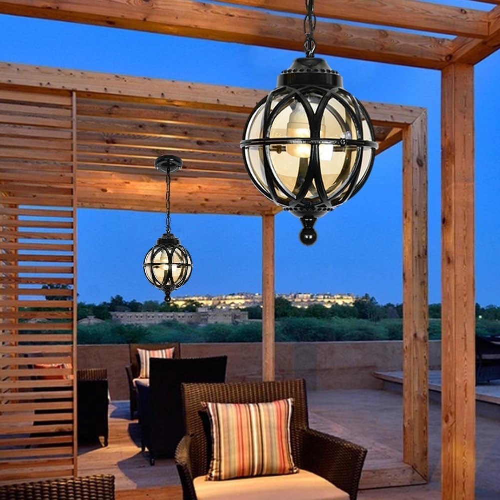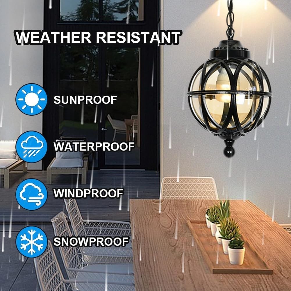 About this item Retro Industrial Design: Classic vintage outdoor chandelier, creating a warm and romantic atmosphere, suitable for installation in any outside space. Provides ample lighting at night. Durable Material & IP23 Waterproof: Mainly made of aluminum die-casting and glass lampshade,high transmittance,anti-corrosion and rust-proof, durable. With IP23 rated waterproof design, the lights work with no problem in the wet location or can withstand even in extreme weather conditions like raining, snowing, or hot temperature. Easy Installation & Wide Application: Hard connection, can be safely installed on the ceiling. Essential mounting accessories included.Outdoor pendant lighting can be a great addition to your house, such as porch, patio, farmhouse, garage, courtyard, front door, backyard, hallway, balcony, garden, corridor, even indoors etc. Suitable Bulb Type: E27 bulb base, compatible with various types of bulb, such as Halogen, LED, Incandescent(Rated power: Max 60W; Bulb is Not Included) Voltage:110-220V. Service: We provide a free replacement for any defects. If you have any question or suggestion, you could click on "ask a question" to contact us quickly, we will help you solve the problem as soon as possible. This vintage ceiling pendant light is a charming addition to any outdoor space, with its waterproofed design making it perfect for use on porches, laneways, and more. The black retro style and 27cm size add a touch of nostalgia to your decor, while the hardwired installation and push button control make it easy to use. The round shade shape and E27 lighting technology ensure a bright and stylish light for your entryway, bar, living room, bedroom, or dining room. Made in the United States, this pendant light is both durable and stylish, weighing 5.2 pounds.