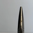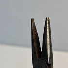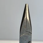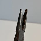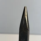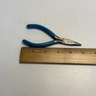 Vintage Channellock model 43 needle nose pliers, approximately 5 inches long. Made in USA. Features slim tapered jaws for precision work, gripping, and bending in tight spaces. Blue dipped handles with classic Channellock styling. Jaws align well and pivot operates smoothly. Cutting edges present near pivot. Finish shows typical wear from use with some discoloration on metal surfaces. Handles show wear but remain intact. See photos for complete details. Condition: Vintage used condition. Surface wear, light rust/discoloration, and handle wear present. Jaws and pivot function properly.
