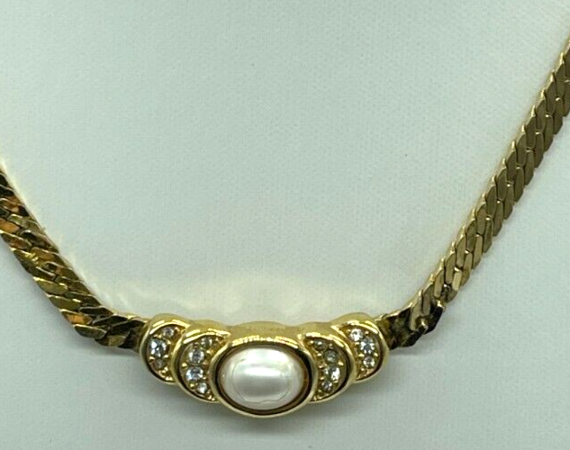 Elevate your style with this stunning vintage Christian Dior necklace. The pendant features a round shape with a white pearl and crystal accents on both sides. The necklace is 16 inches long and has a herringbone chain type with a snap closure. Perfect for any occasion, this necklace exudes beauty and elegance. It is signed by the designer himself and is a true piece of fashion jewelry history. Add a touch of sophistication to your wardrobe with this amazing necklace. Bin N 115