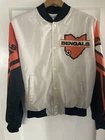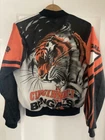 The product is a vintage Cincinnati Bengals Chalk Line Fanimation All Over Pt Jacket in size XL. It is a multi-color jacket featuring designed for unisex adults. It is officially licensed by the National Football League (NFL) and is suitable for the regular season. The jacket is branded by Chalk Line.