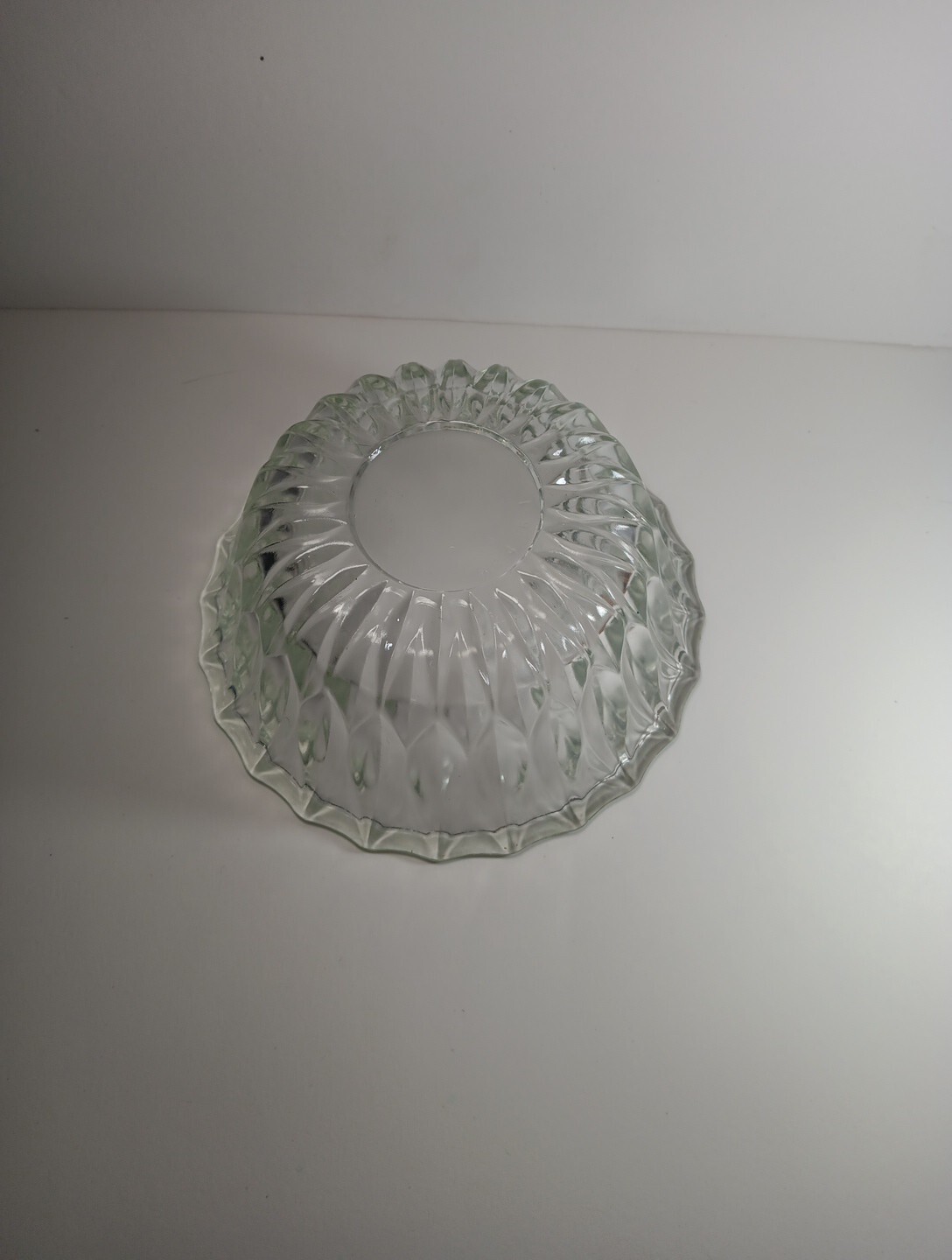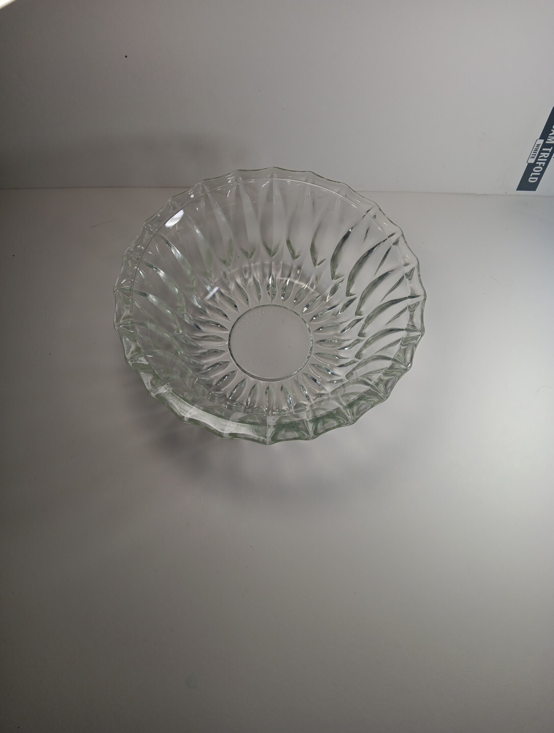 This is a vintage clear glass bowl that can also be used as a candy dish. It features a sunburst design and is unbranded. Made of glass, this bowl is a decorative piece that adds a touch of elegance to any setting. NO chips/cracks. This item is a part of an Estate Sale. All items are sold AS-IS. All sales are final. G.....