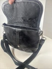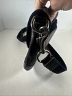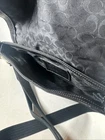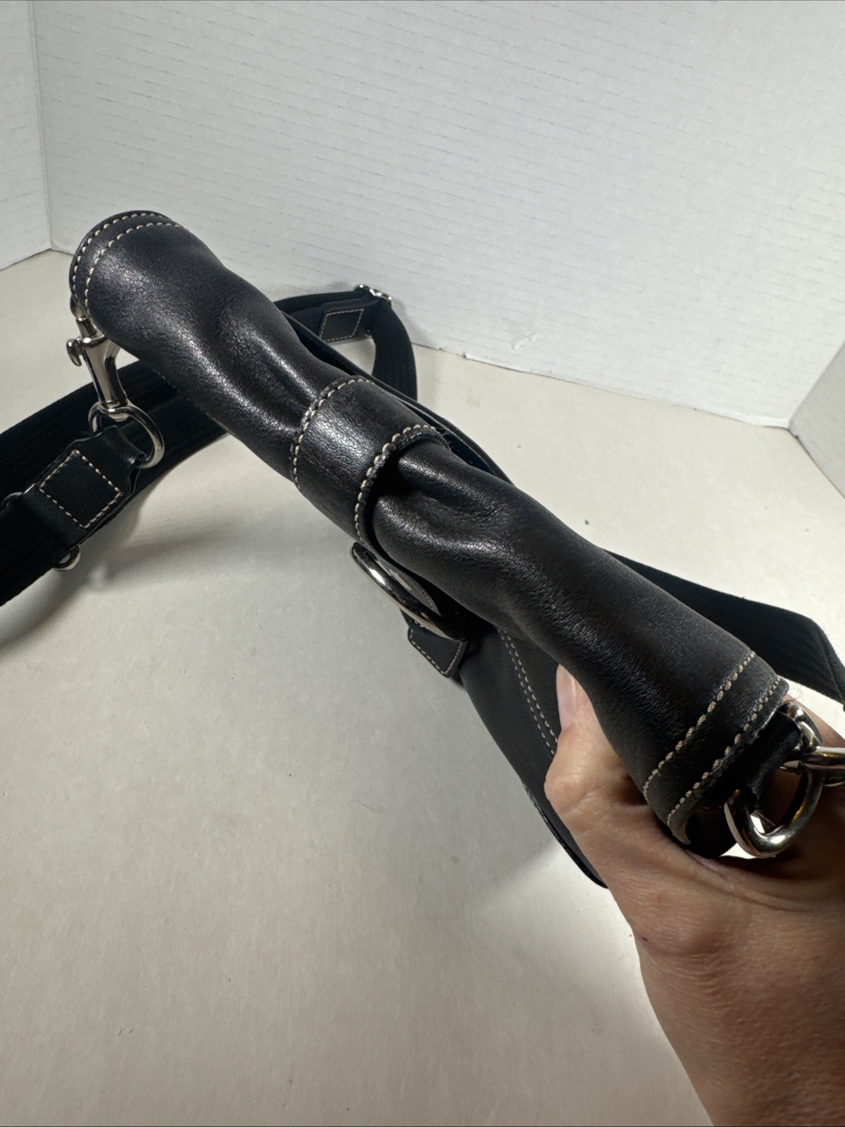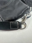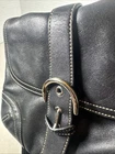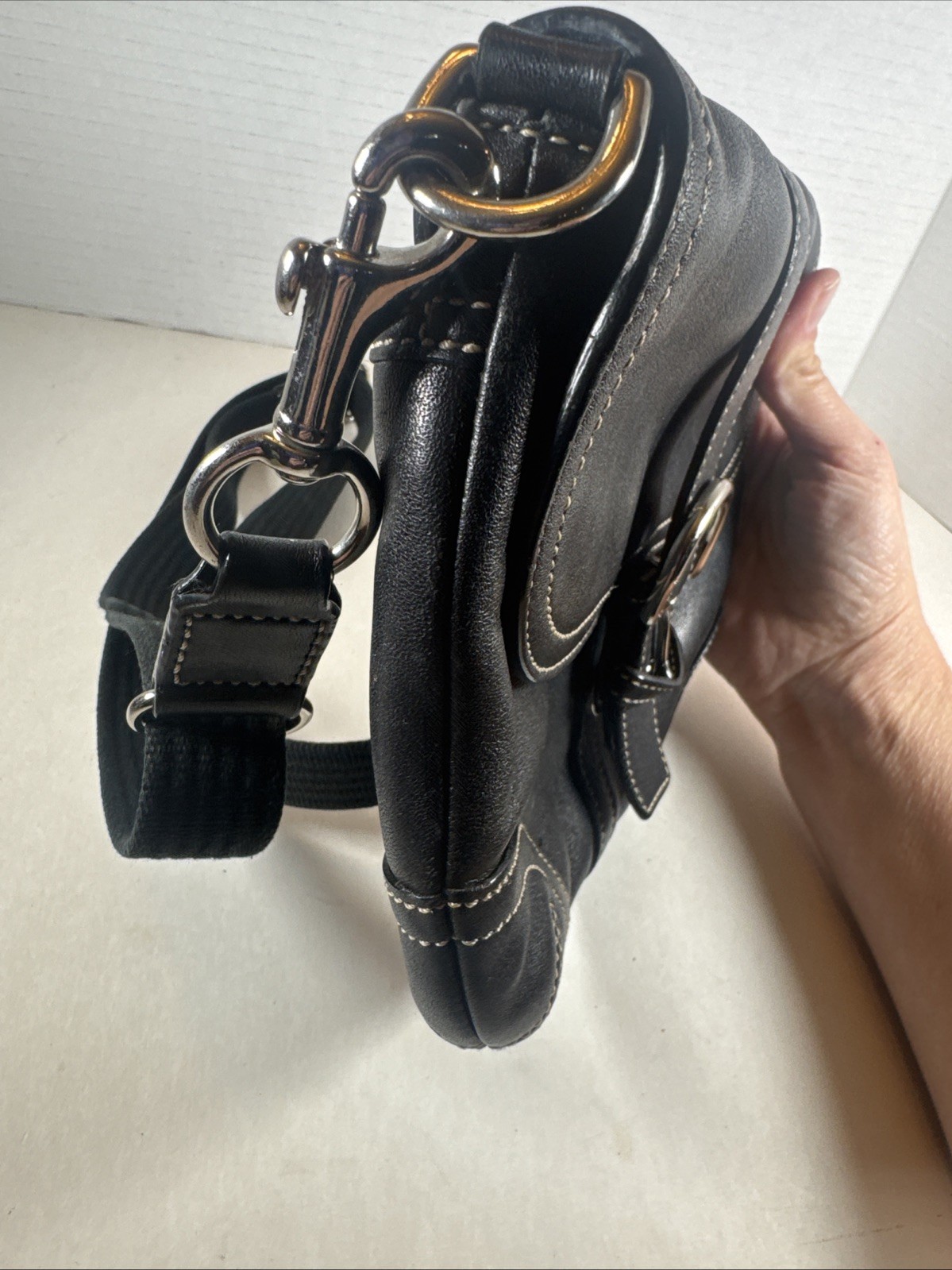 The Vintage Coach Mini Black Leather Soho Crossbody Purse is a stylish and practical accessory for women. Made of high-quality black leather with silver hardware, this square-shaped purse features a magnetic closure and a detachable crossbody strap. The mini size makes it perfect for carrying essentials while on the go, and the adjustable strap allows for customized comfort. The classic black exterior with a matte finish adds a touch of sophistication to any outfit, making it a versatile addition to any wardrobe.