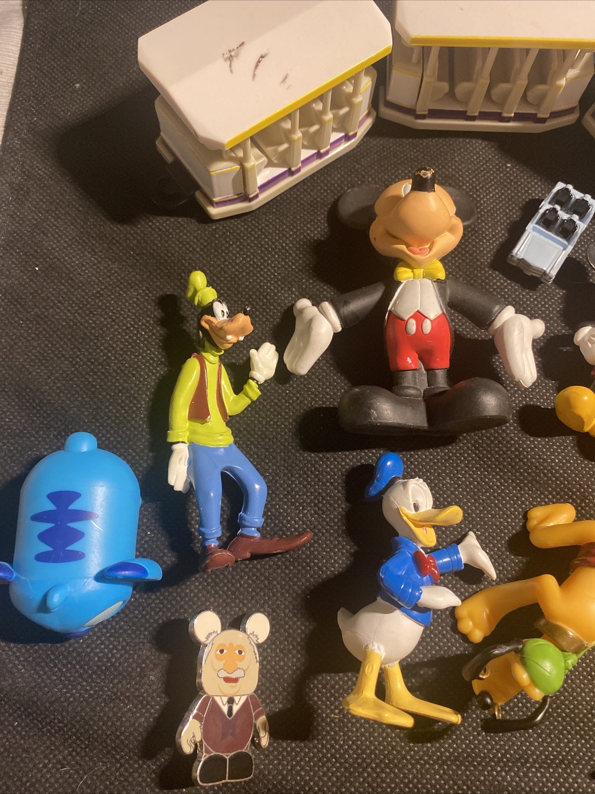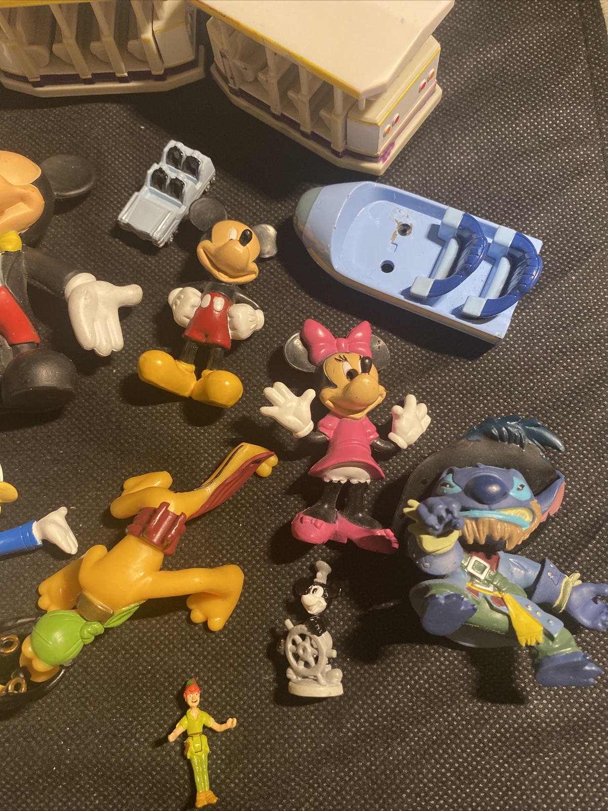 These items are sold as pictured. Please see pictures. Pre-owned / used some items have play wear please see pictures 16 pieces Mickey Mouse (2) Steamboat Willie (1) Peter Pan small (1) Stitch (2) Disney Tram (3) some marks pictured Space mountain car (1) missing piece pictured Rock n Roller Coaster car (1) Trading muppets pin (1) Donald Duck (1) Goofy (1) Minnie Mouse (1) Pluto (1) All sold as pictured.