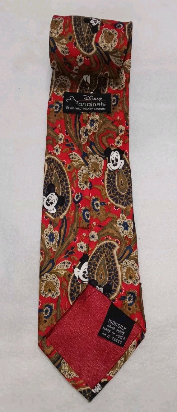 The product is a vintage Disney Originals Mickey Mouse men's neck tie in red with a paisley design. This unique and nostalgic accessory is perfect for adding a touch of retro charm to any outfit, especially for fans of Disney and vintage fashion. The tie features the iconic Mickey Mouse character and a classic paisley pattern, making it a stylish and fun addition to any man's accessory collection.