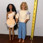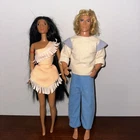 This rare set of vintage Disney Pocahontas and John Smith Barbie dolls is a must-have for any collector. The dolls stand at 12 inches tall and are made of durable plastic material. The set includes both Pocahontas and John Smith fashion dolls, each with their own unique hair type, wavy, curly, straight and varying hair color, and complexion. The dolls come from the 1990s era and are part of the Disney Barbie Dolls collection. The set does not include any packaging and is in excellent condition. These original Disney dolls are perfect for display or play and would make a great addition to any doll collection.