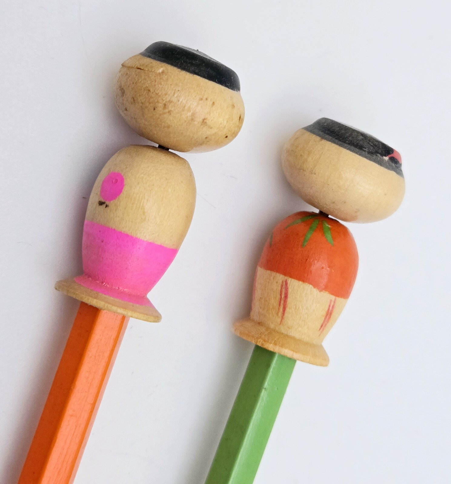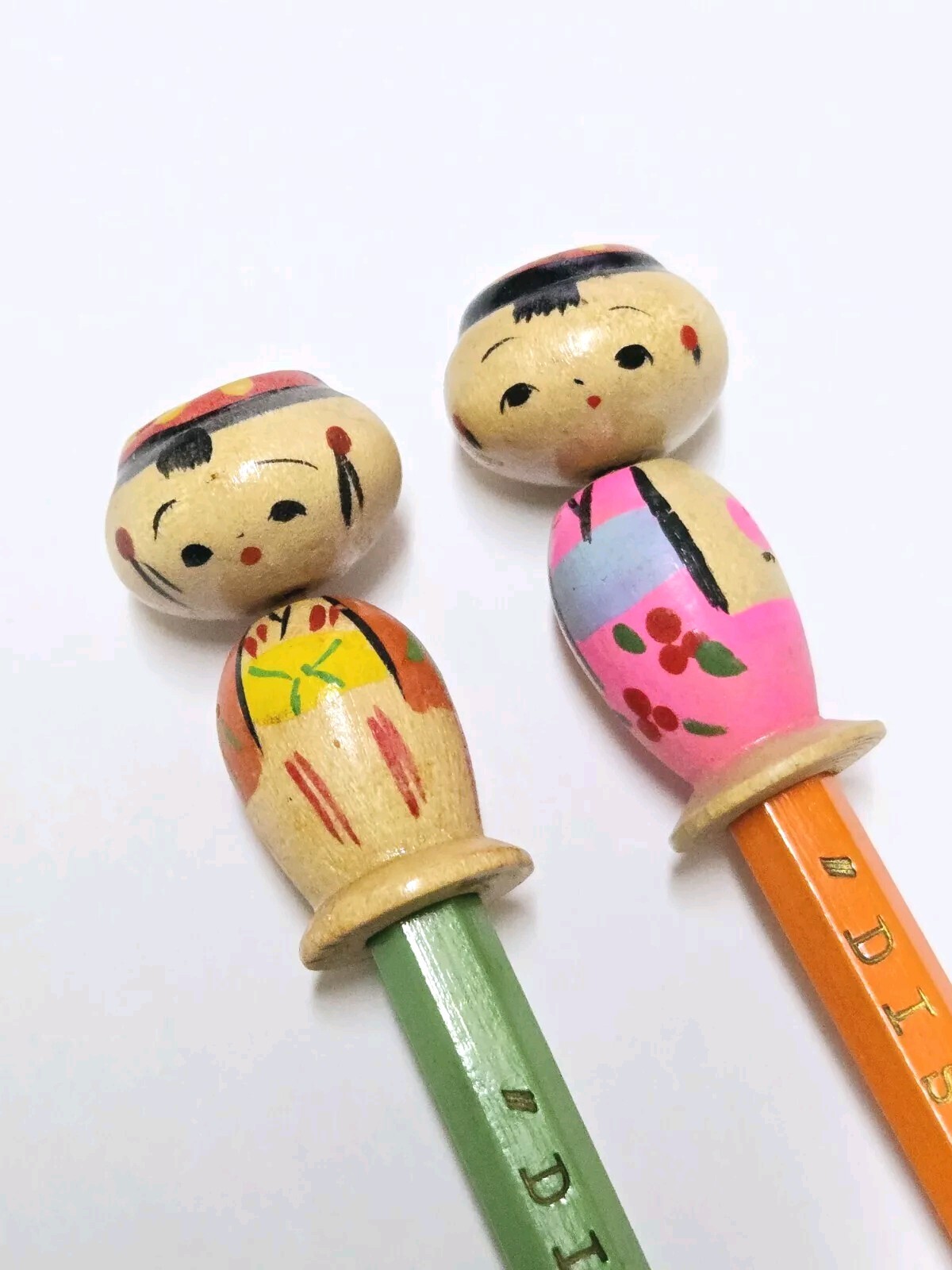 Japanese hand painted Kokeshi Dolls on Disneyland Pencil These were purchased either in 1956 or in the mid 1960s when my mother visited Disneyland. They have been kept in the original package and packed away ever since. The dolls are 1 1/2" tall. The overall length with the pencil is 8". See photos for more details.