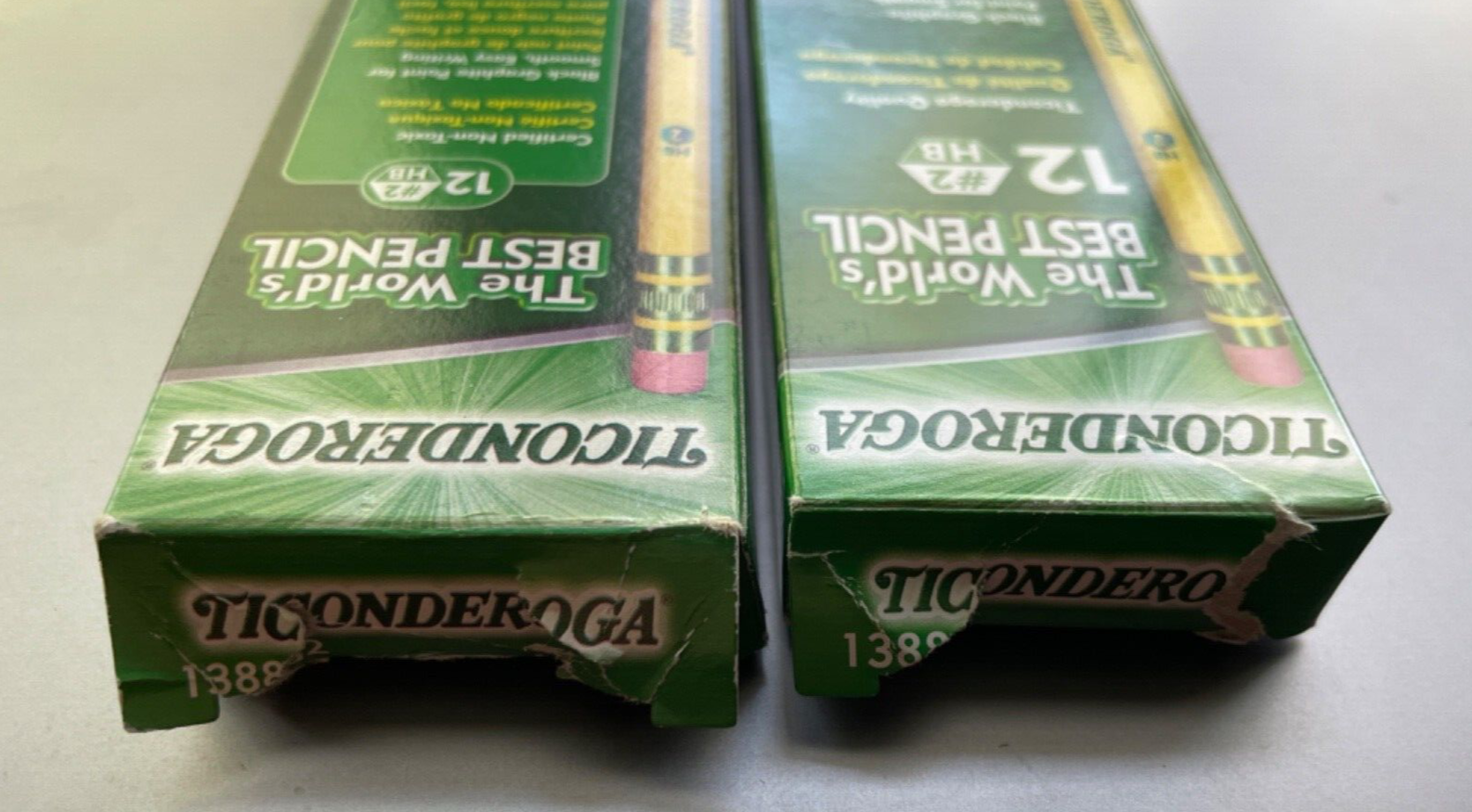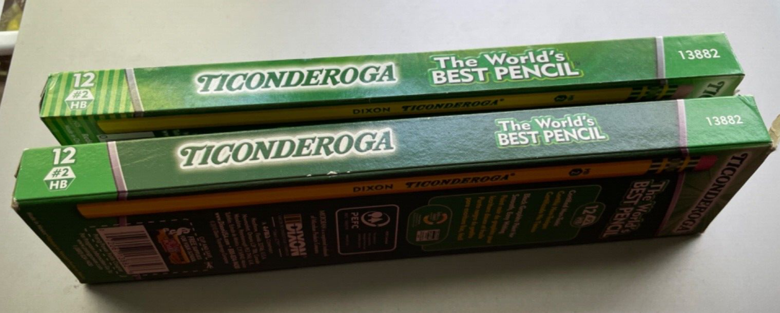 Up for sale: VINTAGE DIXON TI-CON-DER-OGA PENCILS 13882 # 2 HB / 17 COUNT 2 SEPARATE BOXES WITH BRAND NEW UNUSED PENCILS: - 12 PENCILS IN ONE BOX with MICROBAN PROTECTION - MADE IN MEXICO - 5 PENCILS IN ANOTHER BOX - MADE IN CHINA "Rounded Edges - pleasing to the fingers" MADE by - Joseph Dixon Ticonderoga Company - "Since 1795" - A FILA Company What you see on the pictures is what you will receive upon winning the bid. Please note opening of both boxes are being ripped at the one end ( see last 2 pictures) ALL SALES ARE FINAL