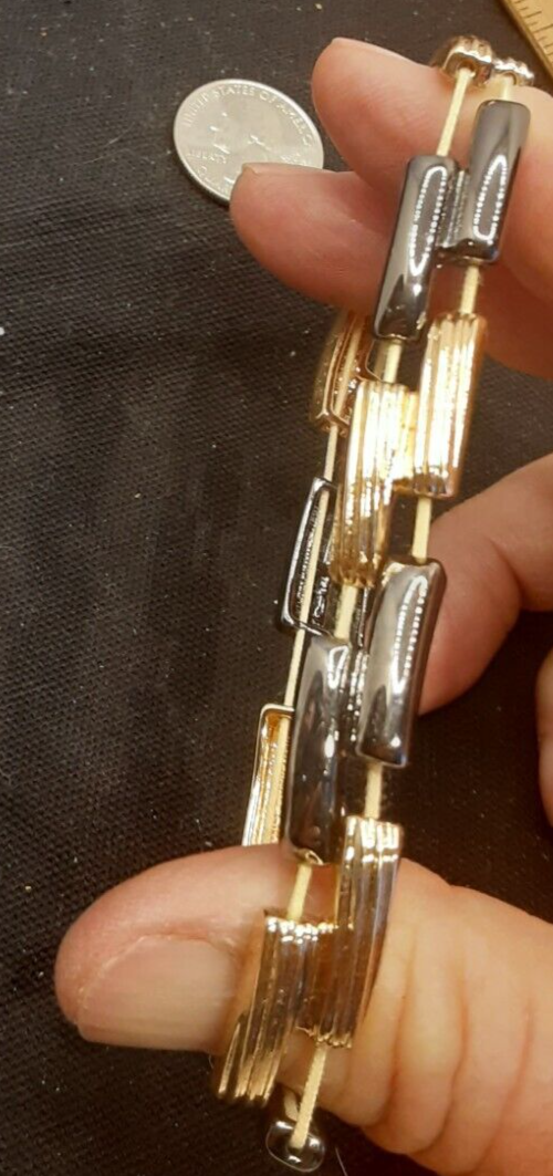 Trendy double rows of black and gold tone segments enhance this striking tennis bracelet. Easy to wear this stays on your wrist and shouldn't strike your opponent. Buy if it calls... Check our other listings... We sell jewelry and art objects that we have purchased at estate sales or online auctions. We do not appraise value, analysize gems, or metals. We only present items based on their appearence. No testing is performed so we cannot guarantee anything other than it is what is pictured. If you are dissatisfied with your purchase you can return within 10 days of purchase. After receipt we will refund your purchase price and initial freight. This applies to jewelry only.