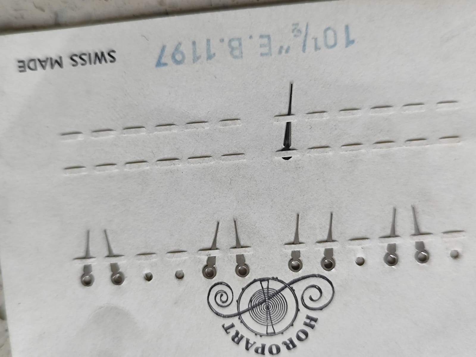 The product is a vintage E.B 1197 movement winding part lot, specifically designed for manual mechanical watches. The hands are silver in color and it is an original NOS (new old stock) item from Switzerland. This part is compatible with EB brand watches, serving as a valuable component for watch enthusiasts looking to repair or restore older timepieces.