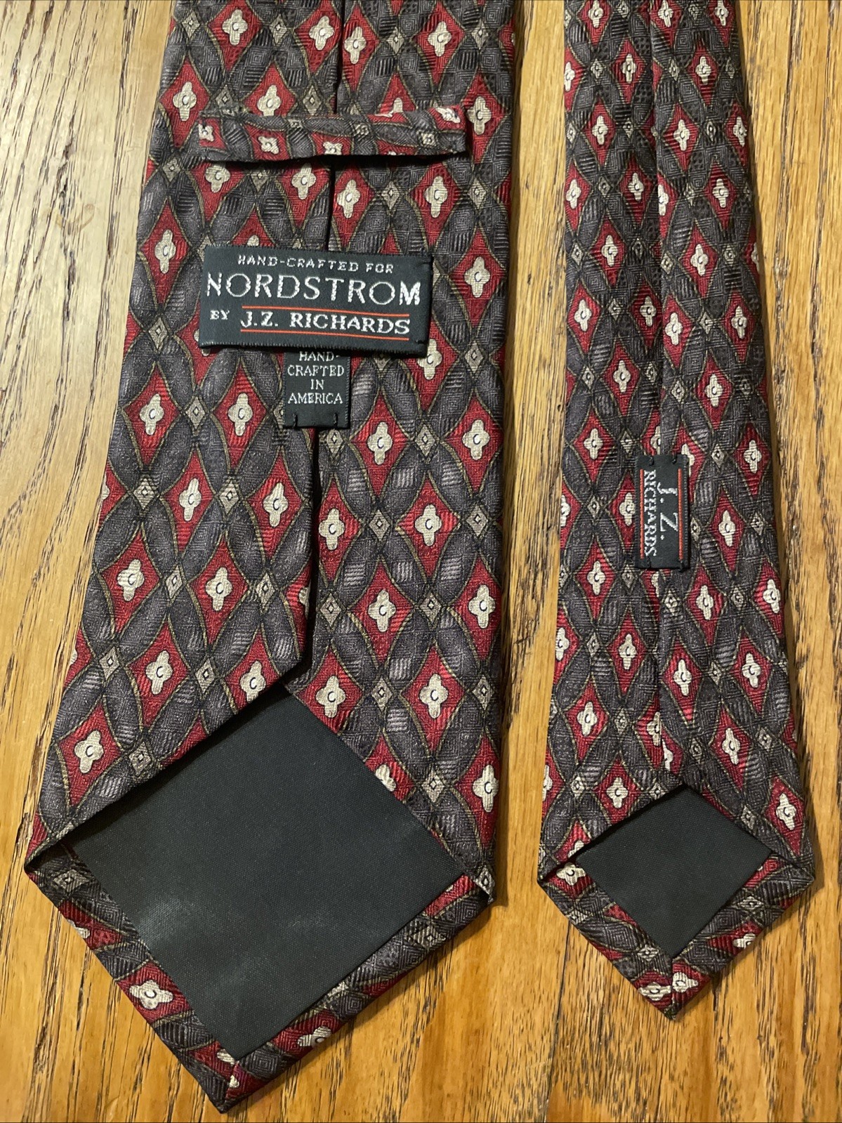 The Vintage EUC J.Z. Richards For Nordstrom USA Hand Made Silk Tie Necktie is a classic and stylish accessory for men. Made from 100% silk satin, this multicolor geometric pattern tie exudes a preppy designer style. With its vintage charm and American craftsmanship, this tie is sure to make a statement and add a touch of sophistication to any outfit.