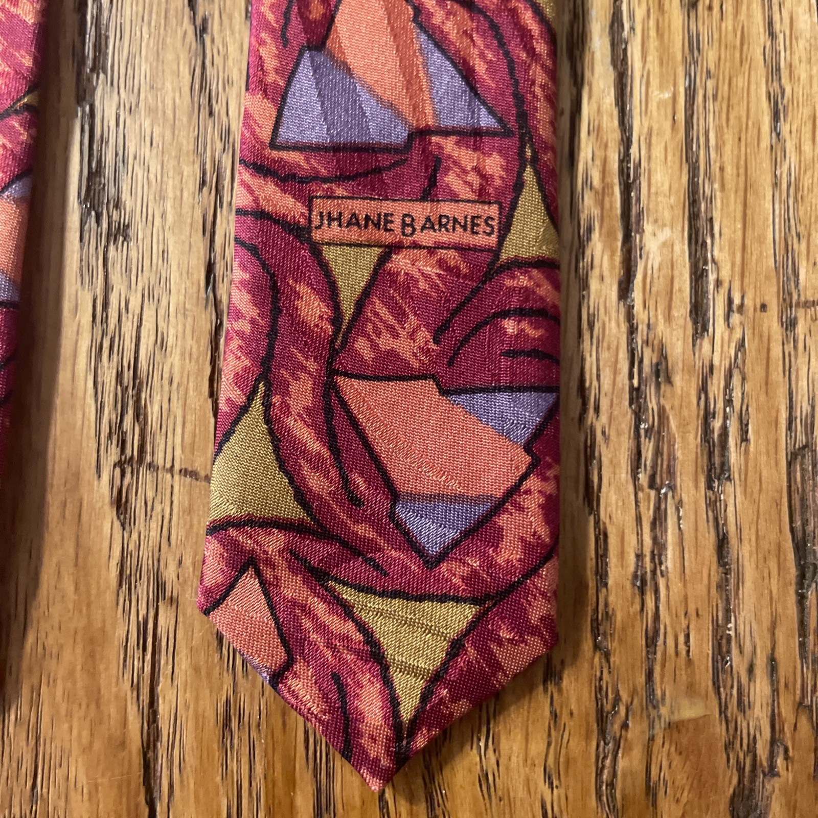 Crafted with the discerning gentleman in mind, this Jhane Barnes necktie marries classic style with a modern twist. The abstract geometric pattern boasts a vibrant multicolor palette that adds a dash of sophistication to any ensemble. Made in Japan, the tie is a testament to exquisite craftsmanship, featuring a classic width that ensures a timeless knot. The luxurious 100% silk fabric offers a smooth, impeccable knot every time, while the designer style embodies preppy elegance. Suitable for a variety of occasions, this tie effortlessly elevates your wardrobe, making it a versatile addition for the style-conscious individual.