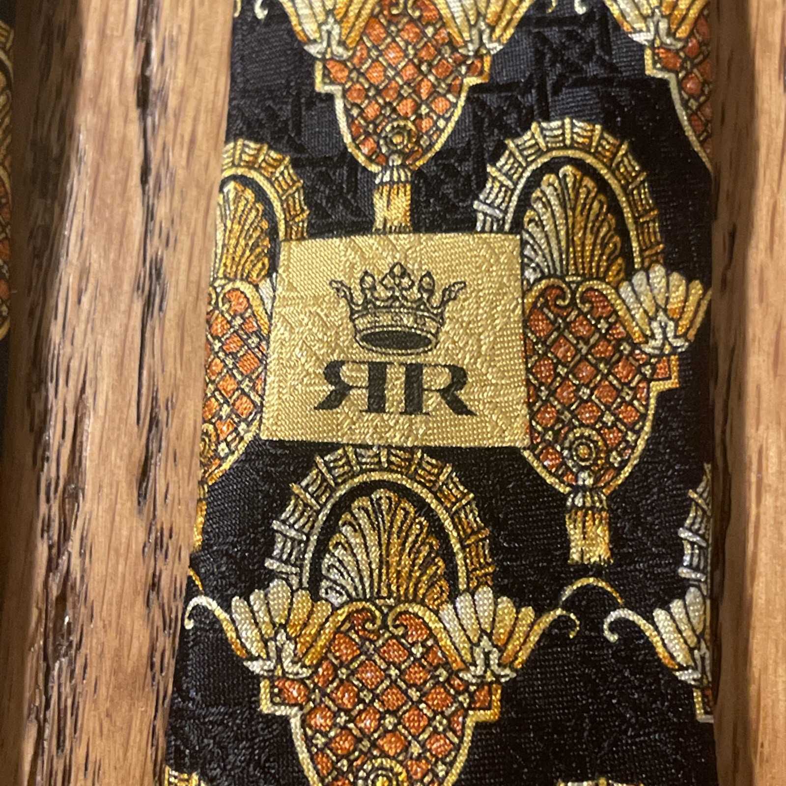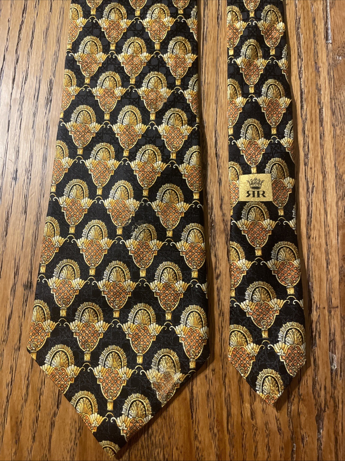 This Vintage EUC Michel Royal Baroque Geometric Silk Tie Necktie is a designer accessory for men, hand-made in Spain by the Richel Royal brand. The multicolor Baroque pattern on 100% silk satin fabric exudes a preppy and sophisticated style. With a classic width, this tie is perfect for adding a touch of vintage elegance to any formal ensemble. Made with quality and attention to detail, this necktie is sure to elevate any outfit with its timeless and intricate design.