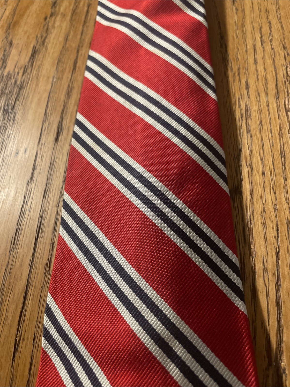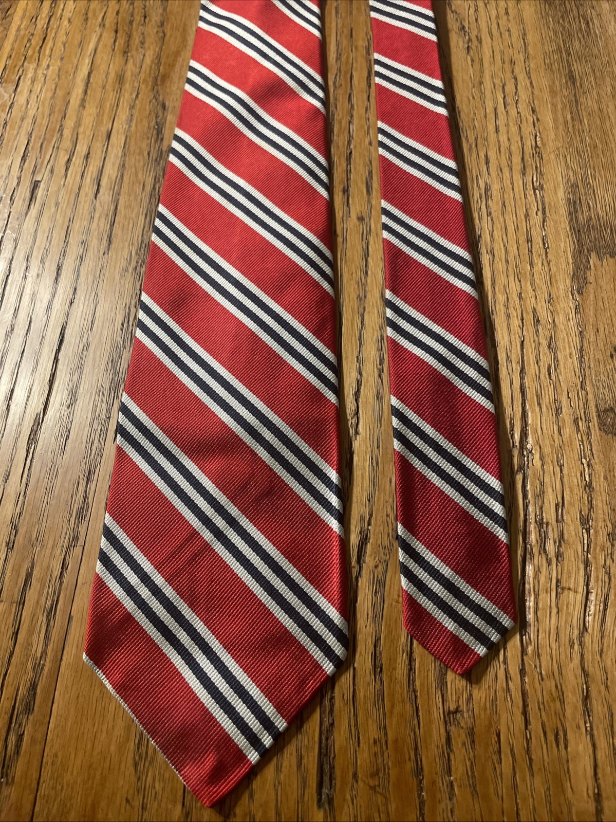 The product is a vintage Robert Talbott Repp Silk Striped Tie, hand-sewn in the USA. This designer tie features a classic multicolor striped pattern on 100% silk fabric, embodying a timeless and sophisticated style. Perfect for adding a touch of vintage charm to any man's wardrobe, this tie showcases the brand's commitment to quality craftsmanship and unique design.