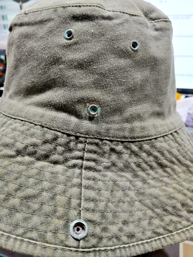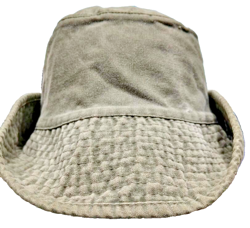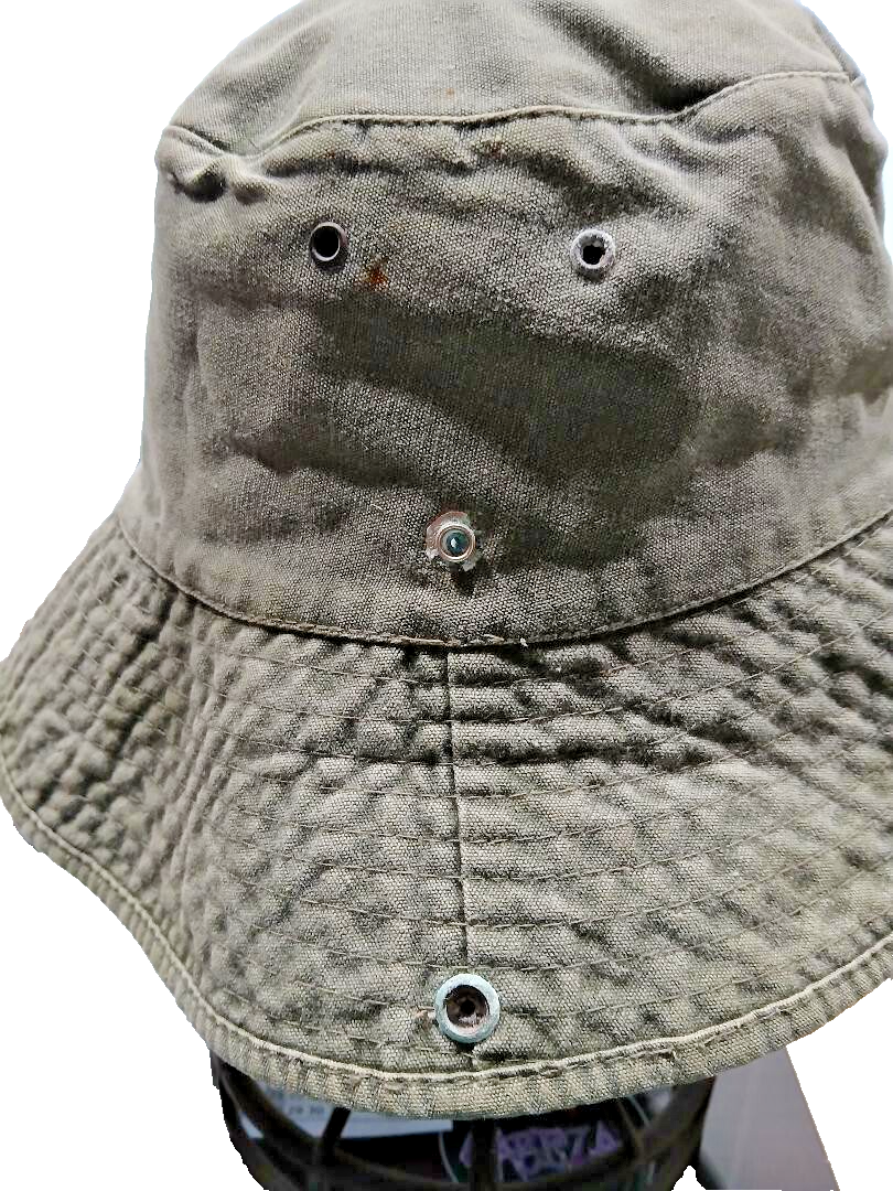 The Vintage Eddie Bauer Bucket Hat is a stylish and practical accessory for men. Made of cotton in an olive drab color, this one-size-fits-all hat features vents and side snap brim for added convenience. The classic solid pattern and durable material make it a versatile and timeless addition to any wardrobe. Perfect for outdoor activities or casual everyday wear, this bucket hat combines functionality with a touch of nostalgia from the iconic Eddie Bauer brand.