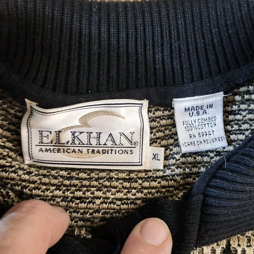 Classic textured knit polo sweater in a sophisticated beige and black pattern. Features ribbed collar, cuffs, and hem in contrasting black. Quarter-zip neck closure. Excellent vintage condition with no visible flaws. Made in USA. Relaxed fit in size XL. Keywords: vintage sweater, polo sweater, quarter zip, textured knit, geometric pattern, american made, elkhan, retro, classic, winter wear, casual, preppy, beige, black, american traditions all items have been cleaned and disinfected we stand behind all we sell so please contact us if you have an issue with any order