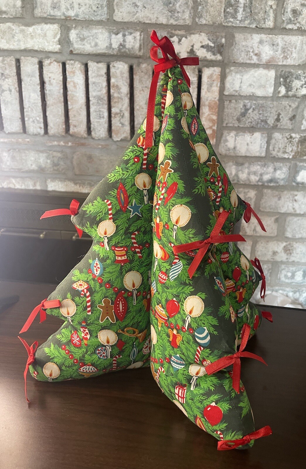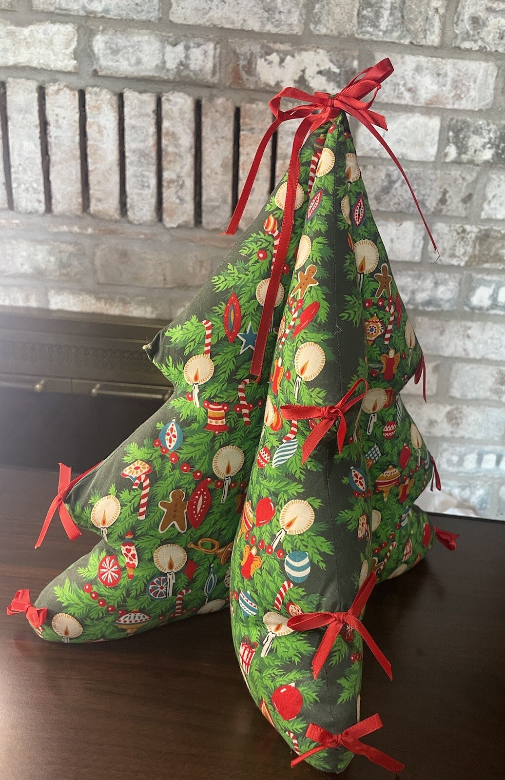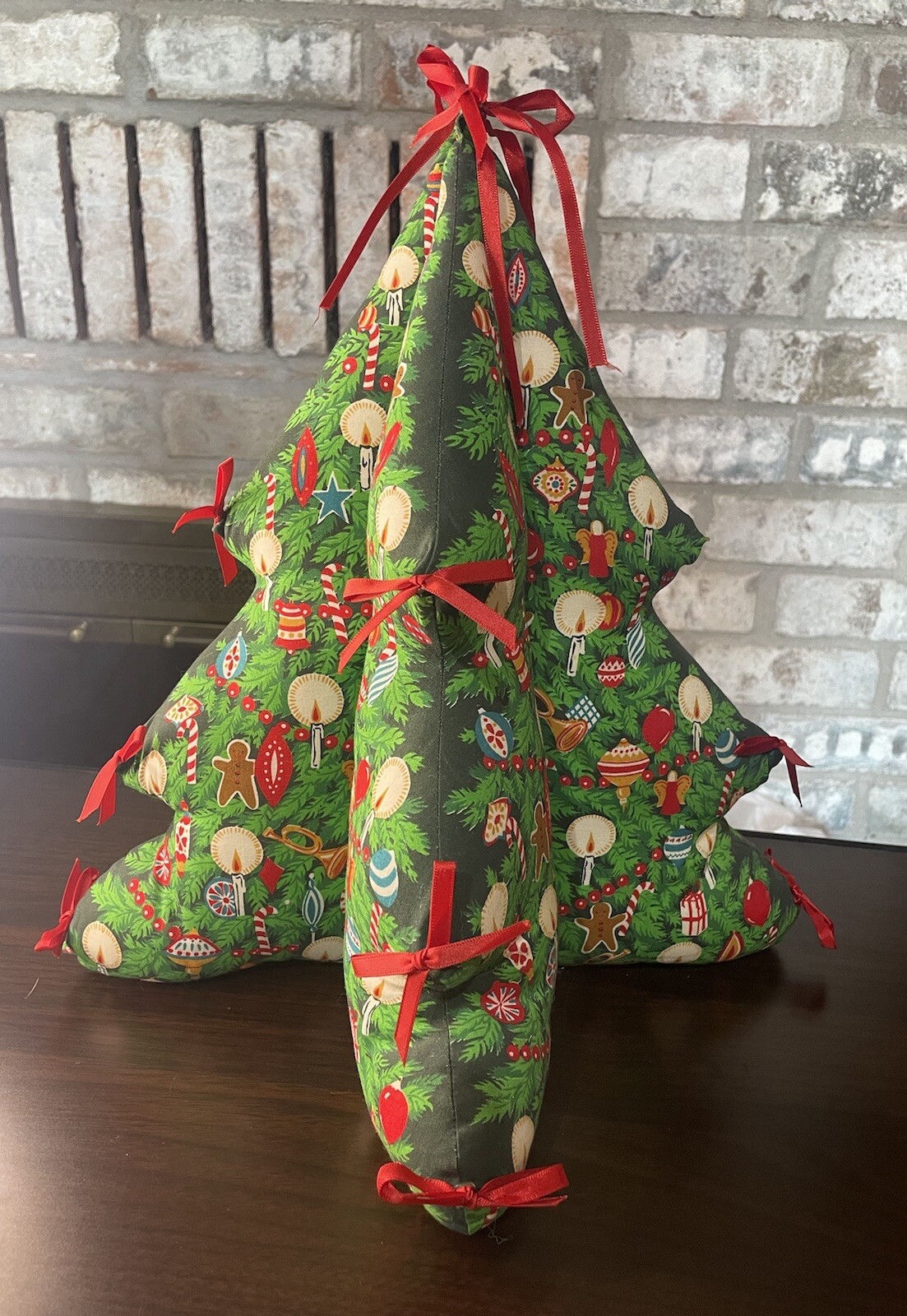This Vintage Fabric Christmas Tree is a one-of-a-kind piece that will add a touch of festive charm to any home decor. Handmade with care, it features 3D red bows, candy canes, and other whimsical details that make it a perfect addition to your collection of holiday decorations. Crafted from high-quality fabric and designed to last for years to come, this Christmas tree is a must-have for anyone looking to add some unique flair to their holiday decor. Whether you're looking for a way to spruce up your living room, or want to add some festive cheer to your office, this handmade Christmas tree is sure to delight. In wonderful condition. Missing one bow.