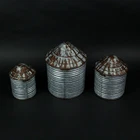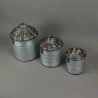 Give your home a fun farmhouse look with this set of silo canisters and bring the rugged charm of the farm to any room. Made of tin, the trio features an antiqued metal roof that also acts as a hinged lid. Though they arrive empty, they are full of character with ribbing and groove details that give them their silo look. Fill with live or artificial plants, decor balls, or whatever you choose, and get creative with your decor, Small: 8 inches high, 5.5 inches in diameter. Medium: 10.25 inches high, 6.75-inch diameter. Large: 12 inches High, 8.13 inches in diameter. For decorative purposes only. Our eBay Store About Us Add to Favorite Sellers Set of 3 Vintage Farmhouse Style Galvanized Grey Zinc Finish Metal Farm Silo Decorative Canisters: Western-Inspired Home Decor Accent Pieces - 12, 10, and 8 Inches High Varied Sizes for Versatility - This set includes Large (10.75"x8.25"), Medium (8.5"x7"), and Small (6.75"x5.5") canisters, catering to diverse decorative needs and spaces. Their thoughtfully designed sizes provide endless possibilities for creative arrangement. Robust Craftsmanship - Crafted from sturdy metal, these canisters ensure years of maintenance-free display. Their durable construction guarantees longevity, making them a reliable choice for enhancing your decor without concerns about wear and tear. Charming Distressed Finish - Featuring a distressed galvanized zinc finish, these canisters exude a rustic country look. The unique finish adds character, making them the perfect addition to any farmhouse-inspired decor setting. Farmhouse Elegance at Home - Infuse your living space with farmhouse charm and rustic flair using these canisters. They bring the fun of the farm to your home, transforming any room into a cozy haven. Their authentic design captures the essence of country living, creating a welcoming atmosphere. houghtful Gift Choice - Whether for yourself or loved ones, these canisters make an excellent gift. Their versatile sizes and country-inspired charm ensure they're cherished additions to any home. Share the joy of farmhouse elegance with friends and family, making their spaces as inviting as yours. Embrace the timeless charm of rural aesthetics with this exquisite set of silo canisters, adding a delightful farmhouse touch to your home decor. Crafted from durable tin, these canisters feature an authentic antiqued metal roof that serves as a functional hinged lid, highlighting their rustic allure. The intricate ribbing and groove details meticulously mimic the design of traditional silos, enhancing their visual appeal. Arriving empty but brimming with character, these canisters offer endless possibilities for creative expression. Whether adorning your kitchen counter or bringing life to any room with live or artificial plants, these versatile containers invite you to experiment with various decorative accents. Their galvanized tin construction exudes vintage charm, effortlessly complementing country-inspired decor themes. Available in three sizes, each canister is thoughtfully designed. The small variant stands at 8 inches high with a 5.5-inch diameter, the medium canister measures 10.25 inches high and 6.75 inches in diameter, while the large canister impresses at 12 inches in height and 8.13 inches in diameter. Perfect for decorative purposes, this canister set encourages you to infuse your living space with the cozy ambiance of farmhouse living. Let the rustic elegance of these canisters transport you to a bygone era, where simplicity and warmth harmoniously coexist, turning your home into a haven of comfort and style. Product Details Color Grey Height 10.75 Length 8.25 Weight 3.25 LB