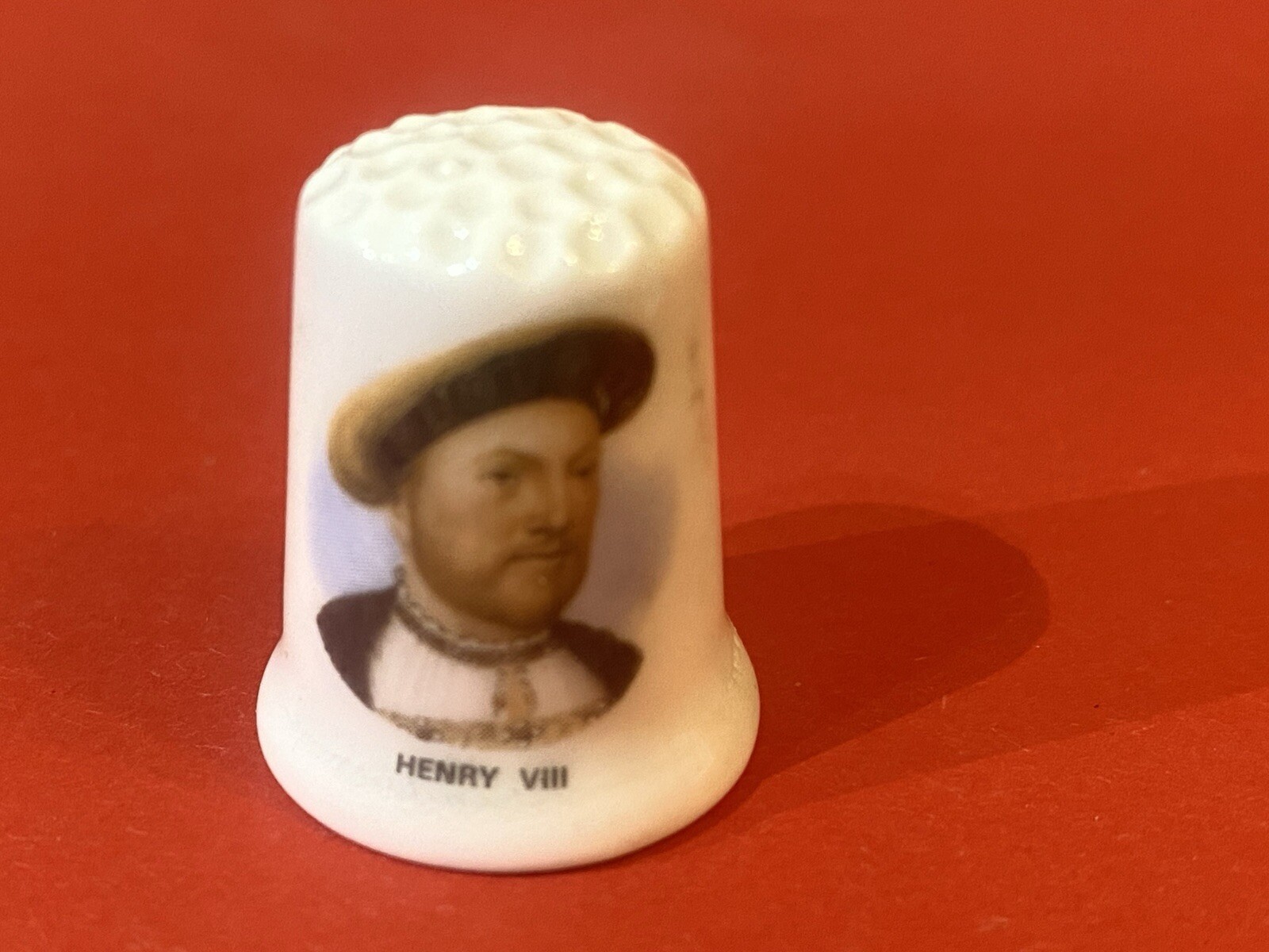 Vintage Fenton Bone China set of Henry VIII and his six wives. Thimbles. Set of bone china sewing thimbles. Unsure of the age but probably 1970’s. Each thimble bearing chronological list of the six wives to rear side. Condition: generally very good except the Catherine of Aragon has a tiny chip on the rim and the ceramic glaze is “crazed”. The Anne of Cleves has a tiny chip on the rim. The printing on the Henry VIII is blurred. The rest being V/G.