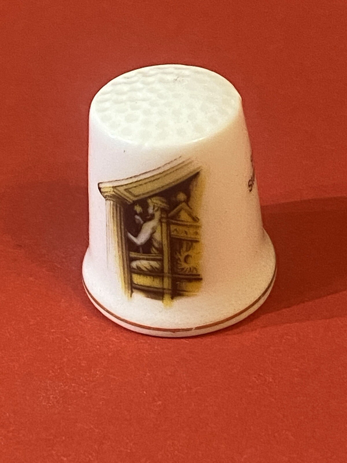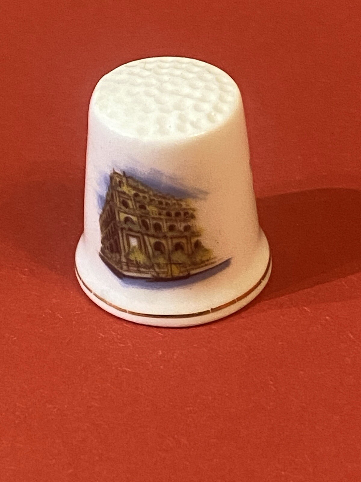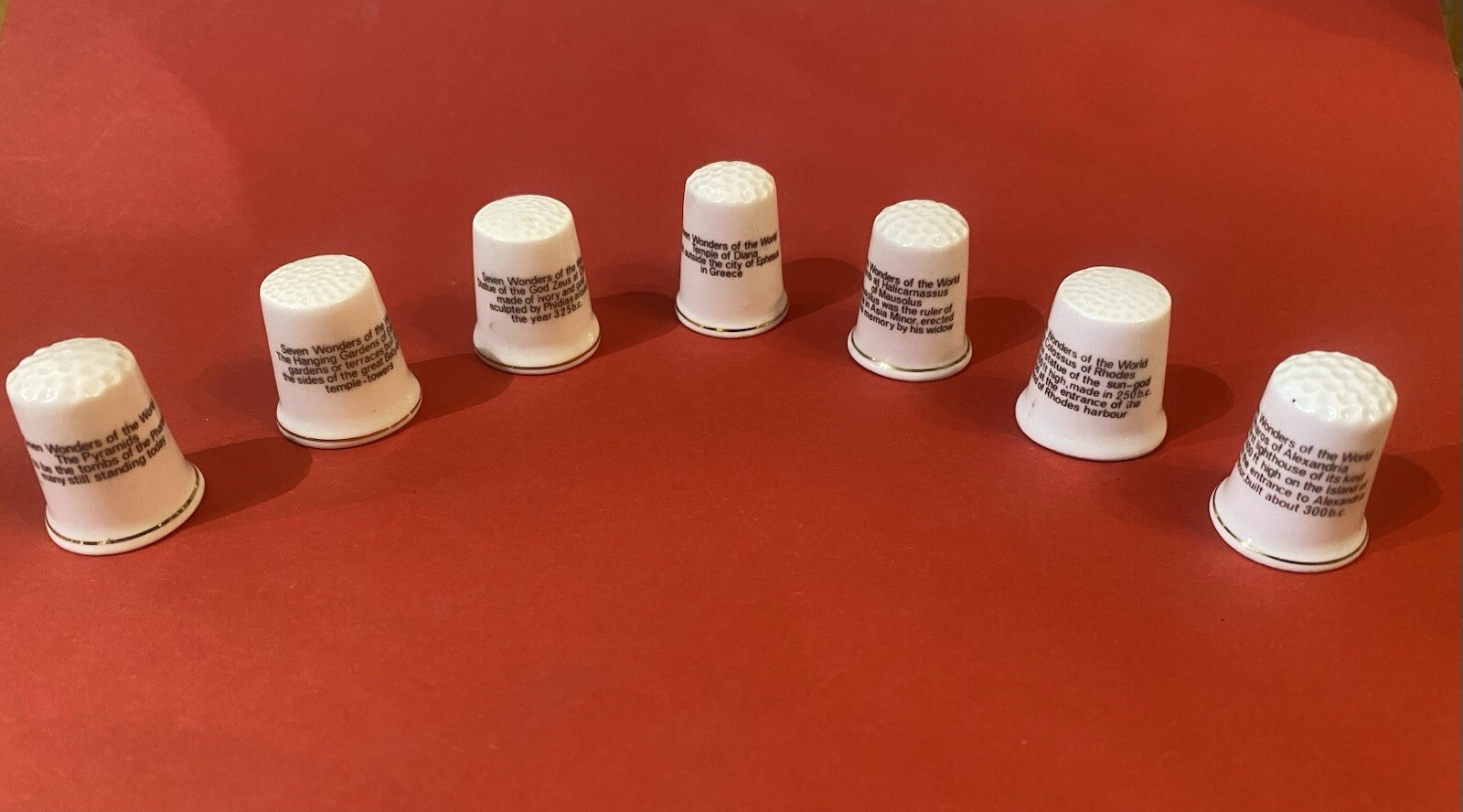 Vintage set of Fenton China Company bone China Sewing Thimbles. The Seven Wonders of the Wotld. Probably from 1970’s. * The Great Pyramid of Giza, Egypt; * The Hanging Gardens of Babylon; * The Statue of Zeus at Olympia; * The Temple of Diana at Ephesus; * The Mausoleum at Halicarnassus; * The Colossus of Rhodes; * The Lighthouse of Alexandria. Condition: Very good.