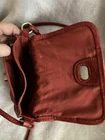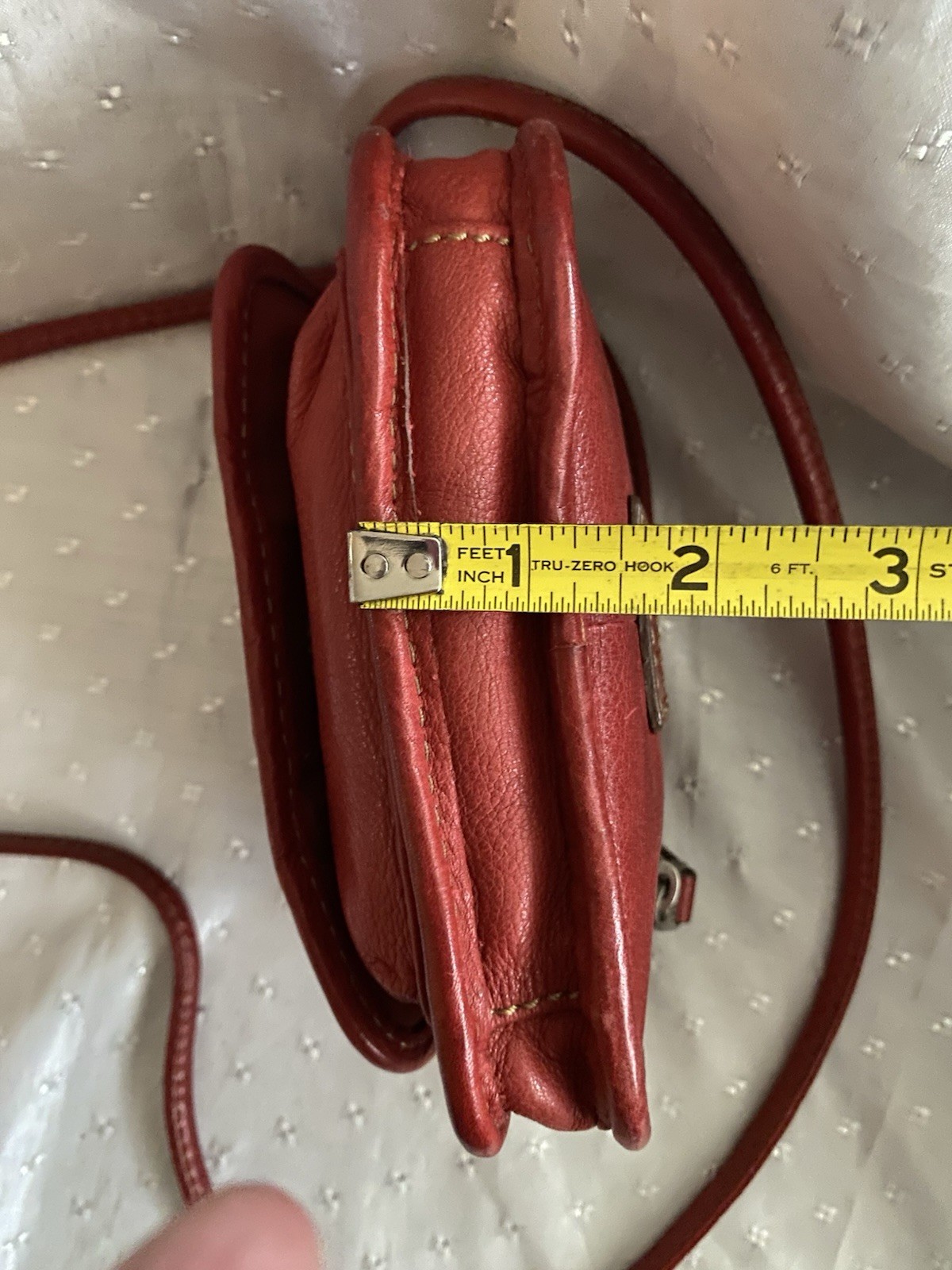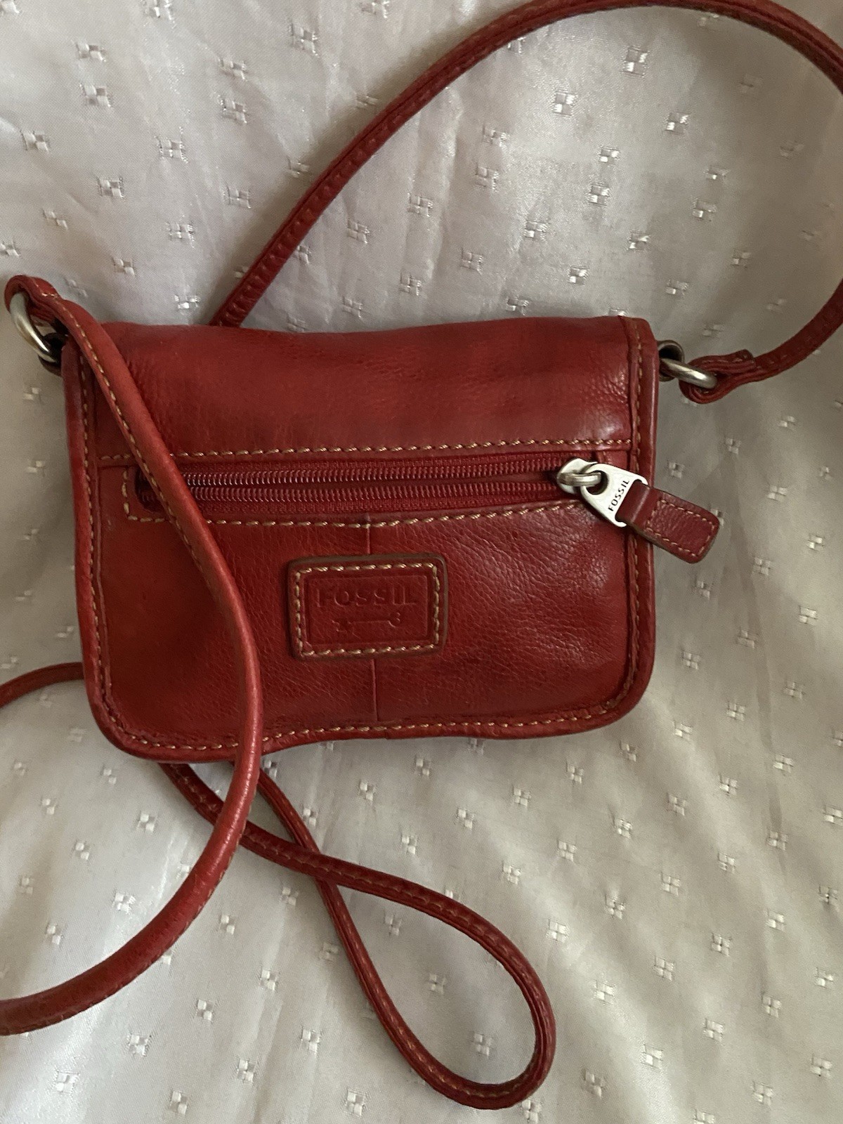 The Vintage Fossil Red Leather Shoulder or Crossbody Bag is a small rectangular handbag with a solid red exterior and pebbled finish. It features a turn lock closure and a long strap in the same red color. The bag is lined with a fabric in red, with silver hardware details. Perfect for casual occasions, this retro-themed handbag exudes a Y2K vibe and is a stylish accessory for women looking to showcase their unique vintage style.