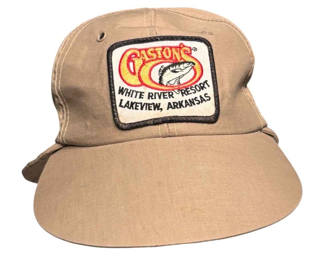 Vintage Gaston’s White River Resort Fishing Hat Khaki Tan Fitted Neck Flap Patch Lakeview Arkansas. Good preowned condition showing normal signs of where. There are a few light marks and some light discoloration on the sweat band noticeable mainly on close inspection. Funky looking style great for the fishing trip. It’s a fitted style with a size medium on the tag. As a point of reference, I typically wear a 7 3/8 fitted hat and this is too small for me. Probably best suitable for a size 7 1/quarter or smaller. Please see photos for design and condition details. Don’t hesitate to message me with any questions.