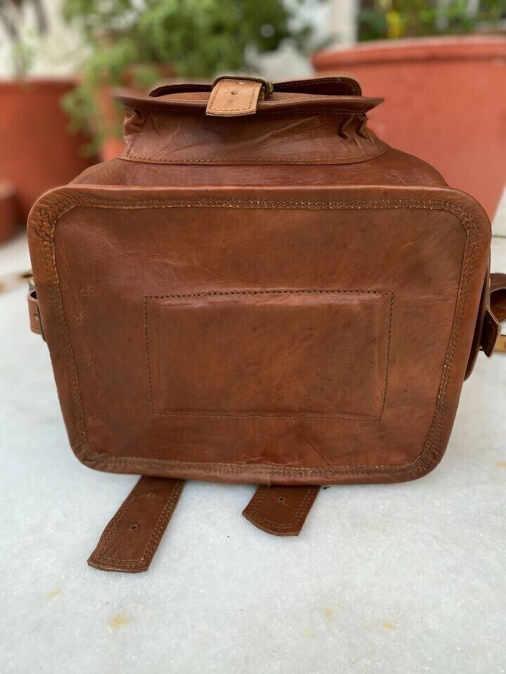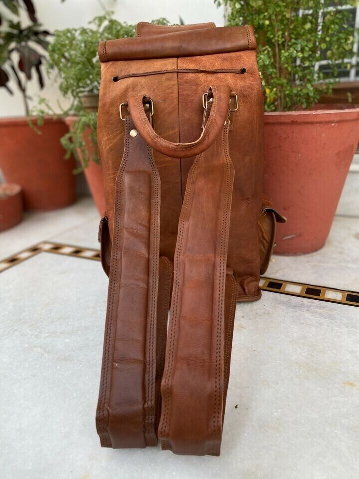 Description Handmade Goat Leather Backpack,Rucksack & Travel Bag QUALITY LEATHER BAG Each bag is individually made using goat leather by experienced crafts people .The bag gets better and better with the time as the leather softens and deep-ens in color. The tonality color of each bag might vary in accordance with the low and high temperatures from the heart of The Thar desert.The leather does not receive any chemical treatment. On the bags a special vegetable oil is applied to give more tonality to the dominant brown (light and dark) color of the bag also making it more resistant to the water.Each bag has its charm and style and a very special earthy smell that will assure you it’s real leather.Its lightness, flexibility and durability will not make you regret your purchase. Features Green canvas fabric Internal 1 big compartment 4 small pockets ADJUSTABLE BACK SHOULDER STRIP SIZE: 16 long x 8 wide x 8 deep (See the picture for more detail) Strong, light-weight goat leather, tanned without the use of chemicals Leather softens and darkens with use Color and texture of the leather varies Natural real leather smell, just like a luxury car or lounge suite Solid brass buckles and fixtures - will last for years Has a wonderful natural look, and feel Each bag is uniquely individual due to slight color and marking variations on natural leather Brand New Handmade Leather Bag without tag Payment Using Paypal is the simplest and easiest way to pay, and is the way we prefer. we know that you will want to get your goods sent quickly so please remember to make your payment quickly after purchase, and we will dispatch within one business day after you have made your payment. if you need a bit of time to make your payment, that's also ok, please contact us to advise how long you need, we are happy to hold your goods for up to week before you pay. if you are purchasing from overseas,please be aware that we can only accept Paypal. Shipping Items will be dispatched within 1-2 working days of payment receiving. Please keep updated your current shipping address with eBay and PayPal. Tracking details will be provided. We always aim to deliver items to our customers as soon as possible. We only use International Standard services of UPS/DHL/FedEx or like others only Terms Of Sale Returns accepted Please write to us before returning the item Buyer should contact us within 20 days of receiving the item Refund will be given in refund or replacement on buyer's choice. Return shipping will be paid by the buyer Item must be returned in its original condition Please write to us for any clarification on RETURN POLICY