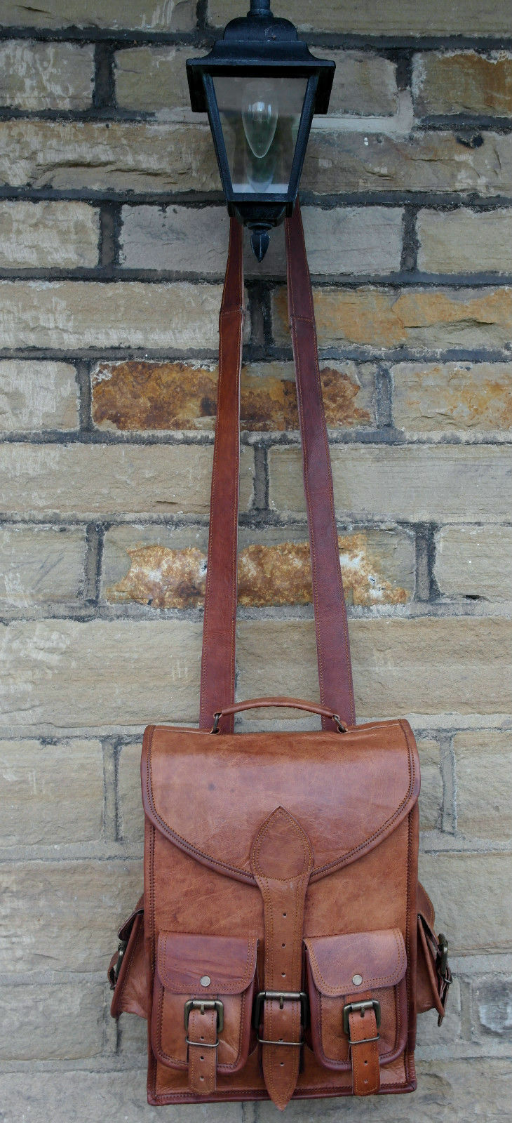 Leather Backpack Rucksack Sling Satchel messenger bag 2 in 1 purpose VINTAGE HANDMADE GOAT LEATHER MESSENGER BAGS SATCHEL BUSINESS BAG ADJUSTABLE SHOULDER STRAP 100% genuine goat leather messenger bag with a durable inner lining made of canvas. Designed to carry mini laptops, tab, documents or other personal belongings, etc. A genuine hand made product using chemical/dye-free leather. Natural oils and light have been used to obtain the style of the leather - chemical free! This bag features a wonderful unique and vintage look, designed to carry mini laptops, tab, documents, personal belongings etc. Perfect for the office, school or as a gift! Specifications: Made from 100% genuine, strong, lightweight, durable goat leather, tanned without the use of chemicals Adjustable shoulder strap, roll close backpack with small front pocket. 2 big inner compartment for carrying files, mini laptop's, tab's etc with padding. 2 zipper compartments for important documents/paperwork etc. Inner canvas lining Vintage leather wash Leather softens and darkens with use Handmade in India by experienced crafts people Size 11 inch wide X 15 inch height Please provide your telephone number as well, so that the post office can contact you when your item arrives, or the item will be sent back to us. We will not be able to resend the item in that case so please make sure to provide your contact number. Please do provide your full address and phone number by eBay message immediately after making the payment for easy delivery. We normally ship within 1 to 2 days. We will offer the tracking number you can track it during the whole shipping process after shipment please check your tracking number after 3 to 4 days and please contact us in any query regarding your package as soonest We only accept Pay pal Payment is to be completed within 3 days of the purchase. Please contact us if you can't make the payment promptly. Otherwise, we will resume the right to re-list the item and the unpaid item report will be made correspondingly.
