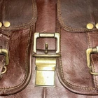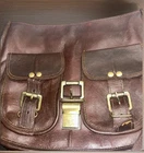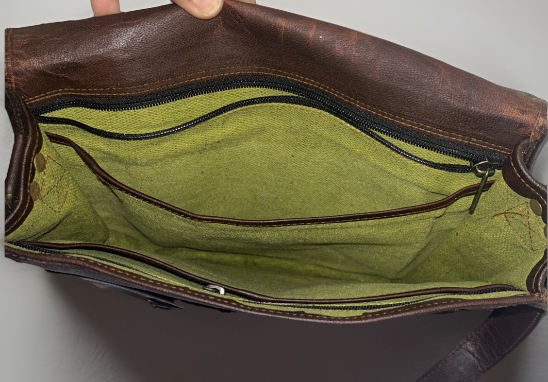 Genuine brown leather messenger bag, with an adjustable crossbody strap and a classic brass buckle closure. It’s made with thick durable cow hide leather with stitching detail that exudes artisanal craftsmanship. Lined with fun green fabric, and a few compartments. Please note: leather shows natural wear and creasing consistent with age and use. See photos for full condition details.