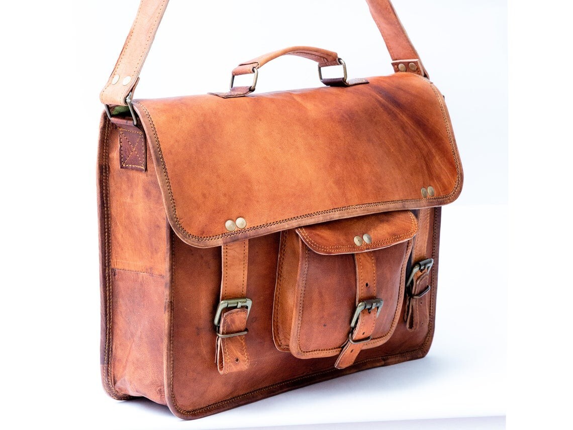 Vintage Brown Genuine Goat Leather Satchel Messenger Bag for Laptop