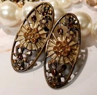 These vintage Austrian crystal clip-on earrings are a stunning addition to any jewelry collection. The oval shape and round champagne gold color of the main stone make them a perfect accessory for any occasion. The intricate design and clip-on closure add to their beauty and convenience. Crafted with high-quality materials, these earrings are a true antique gem. The brand and metal type are unknown, adding to their mystery and allure. Perfect for those who appreciate the beauty of vintage jewelry, these earrings are a must-have for any fashion-forward individual. 1" Width 2" Length Clip Earrings Champagne & black crystals