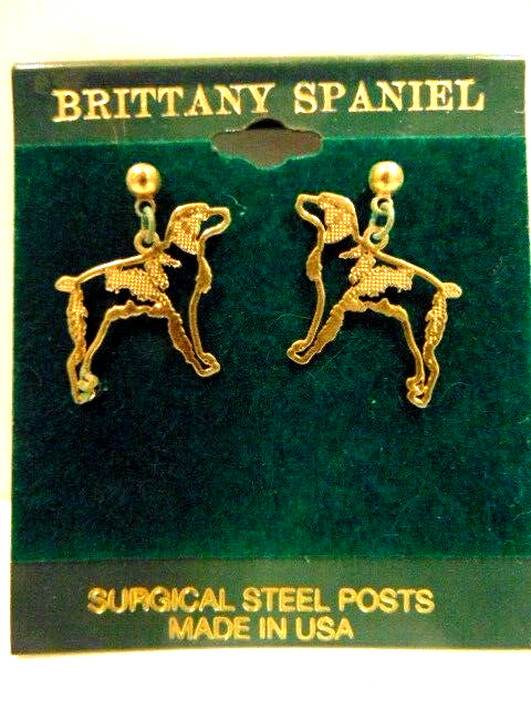 Here is an " old store stock" gold color pair of Brittany Spaniel dog shaped earrings. They are unused and were purchased from a business that closed. They are about 7/8th inches wide. The display card is about 2 1/2 X 2 3/4 inches. Please see pictures and ask any questions . Thank you for looking. (Inv 28,6 )