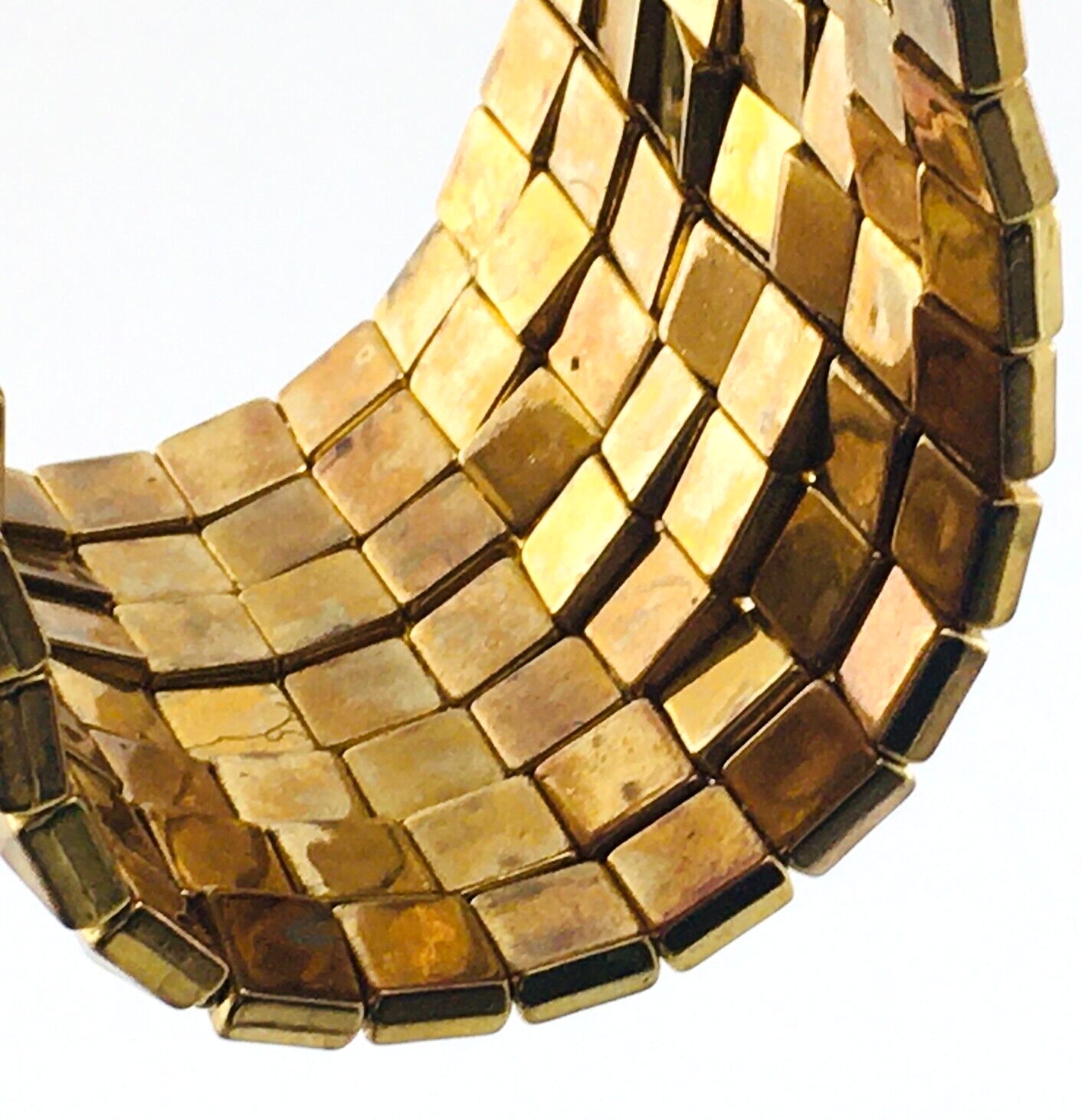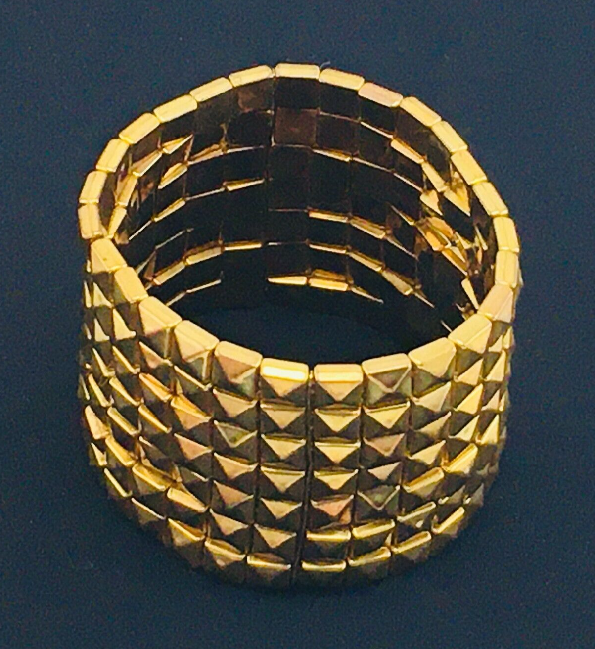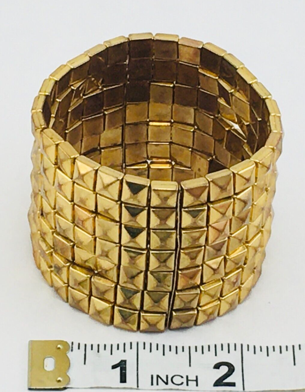 Vintage Wide Textured Squares Stretch Gold Tone Metal Bracelet. Adjustable. Very Good Vintage Condition. Thank you for your interest in this item. If you have any concerns please don't hesitate to contact us. We will happily combine shipping. I hope you can take a moment to visit my store at: ebay.com/str/couldntbebettercollectibles Let me know the things you like to collect. Happy Shopping.