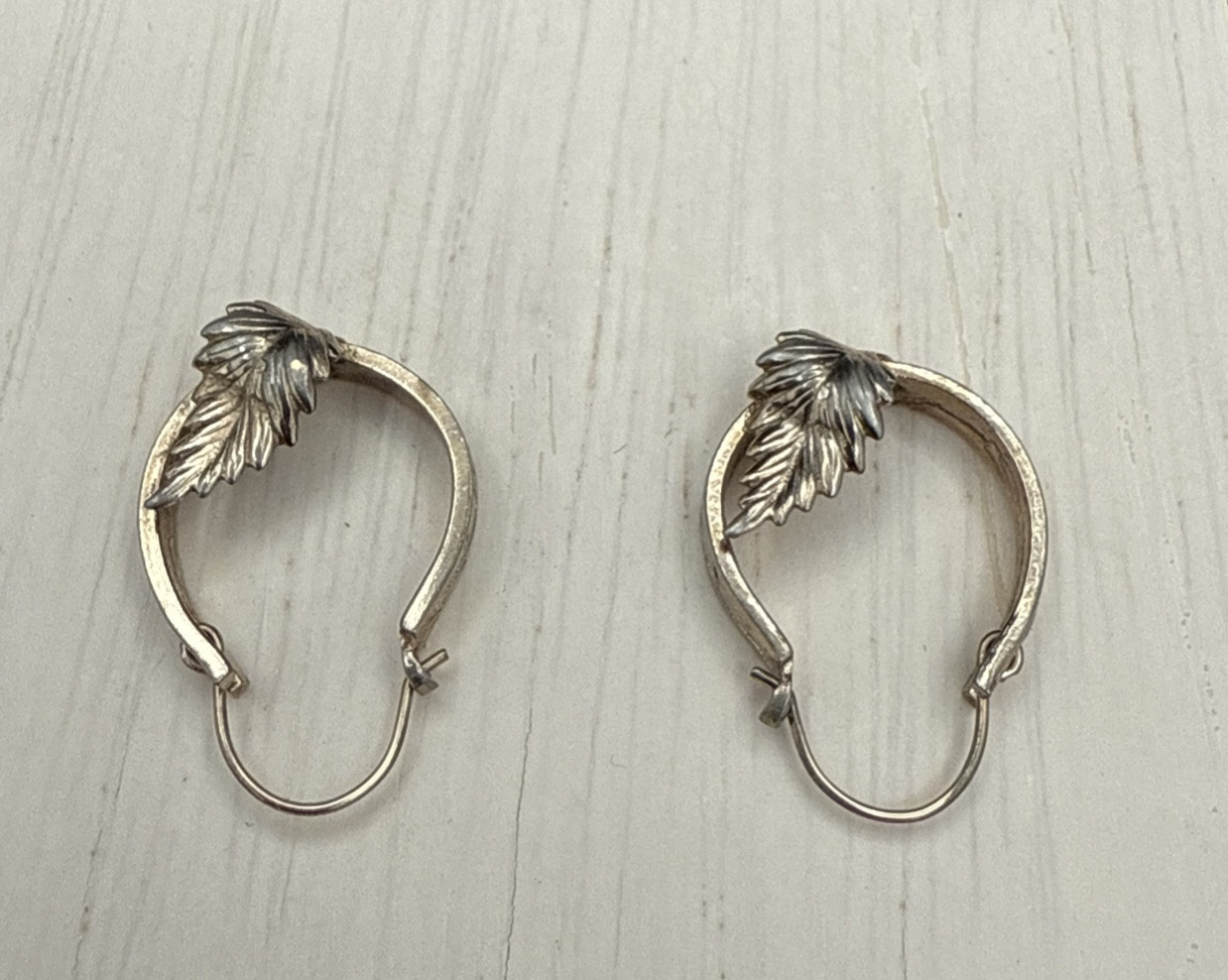 Vintage EARRINGS Faded Gold Tone Small Hoops with Leaf Attached To Side PRETTY! (5598)