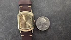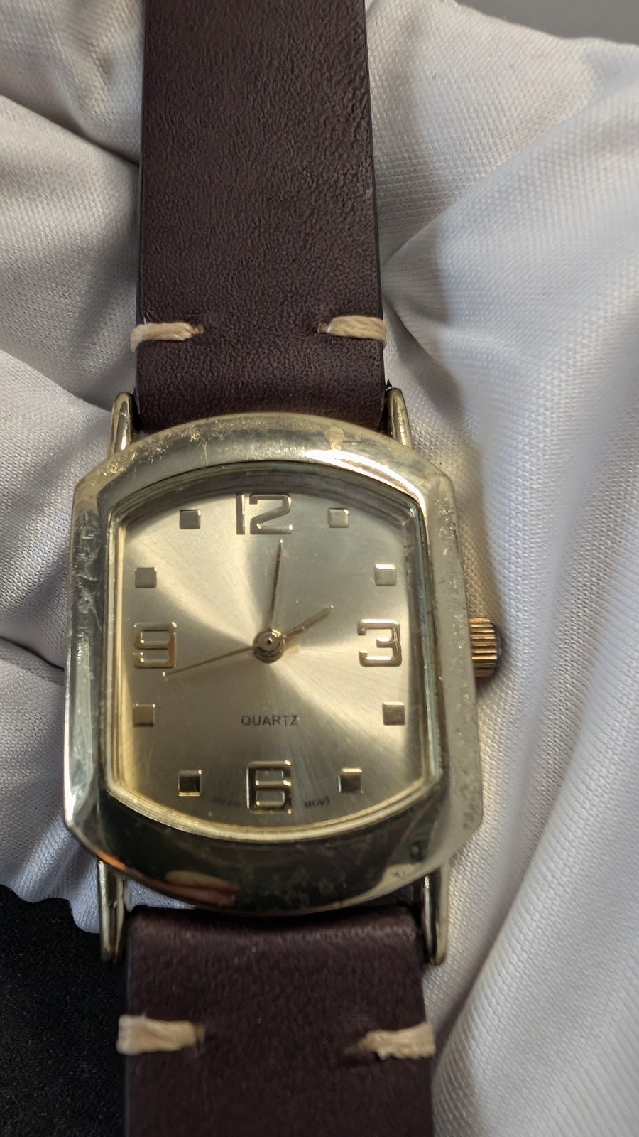 Features: Classic gold-tone square case with curved edges Sunburst champagne dial with raised gold-tone indices (12/3/6/9) Reliable Japan quartz movement (new battery installed) Never used – protective caseback sticker still intact Brand new vintage-style faux leather strap with beige stitching Stainless steel back, made in China Condition: Watch is in new old stock condition with a protective film still on the caseback. The case has minor shelf wear and scuffs from storage but was never worn. The brand new faux leather band adds a premium vintage aesthetic with its stitched detail and rich brown tone. Measurements (approx.): Case Width: ~34mm (excluding crown) Lug-to-Lug: ~42mm Band Width: 18mm Keywords/Tags: Retro unisex watch, gold vintage watch, 90s style quartz watch, Japanese movement, faux leather strap, rectangular watch, minimalist dial, casual classic, stainless steel back