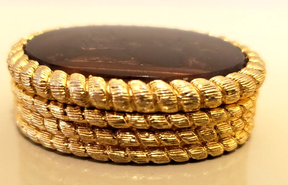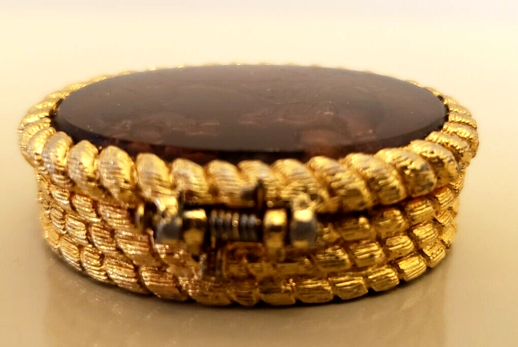 Vintage Gold Tone Trinket Box Hinged Glass Cameo Lid Man and Angel 2". Condition: Excellent pre-owned condition.