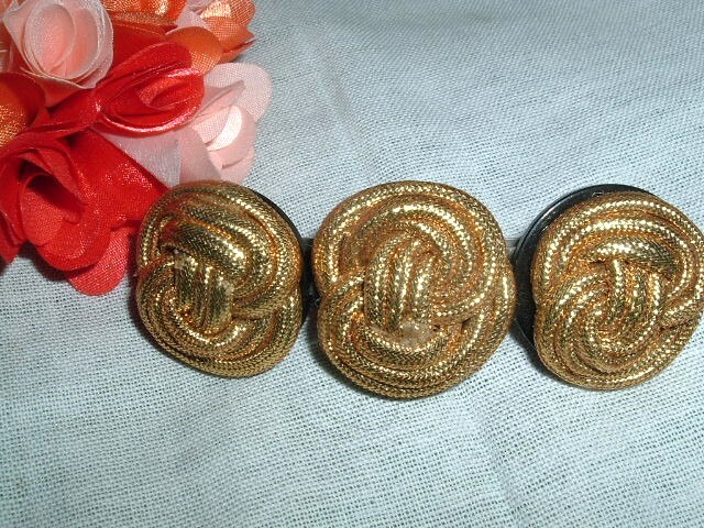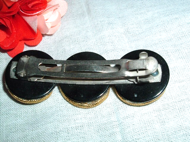 From a Chicago estate sale, a vintage 3.5" wide, 1" tall hair barrette with 3 swirls of golden cord on silver clip back. Condition is excellent. We combine ship.