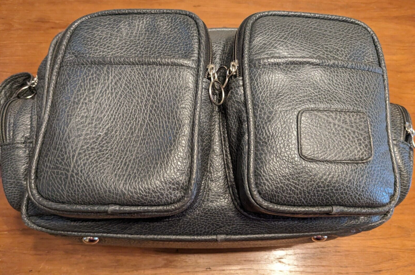 Vintage pebbled probably bonded or faux leather duffle bag. Bag has one large interior compartment (6" wide) plus a second 2" thick second main compartment. These two main compartments are zippered separately and separated by a thin piece of nylon fabric on the inside. There are two zipped enclosures on the front that have pockets on them and two zippered enclosures on the ends. My father used this to hold camera equipment. The main compartment is 15 x 8 x 9 inches, and the entire bag is 18 x 11 x 9 inches. It has a nice nylon padded lining throughout. Bag weighs almost 2 pounds. All zippers work fine and the bag is in relatively good shape. The shoulder strap has been resewn and there is a tiny bit of wear on the exterior. I do not see a brand (tag) on the bag. The bag is super soft and flexible. I thought at first it was genuine leather but since I am not sure, I am listing it as maybe not real leather. It must be at least 30 years old, and it has kept it's condition well.