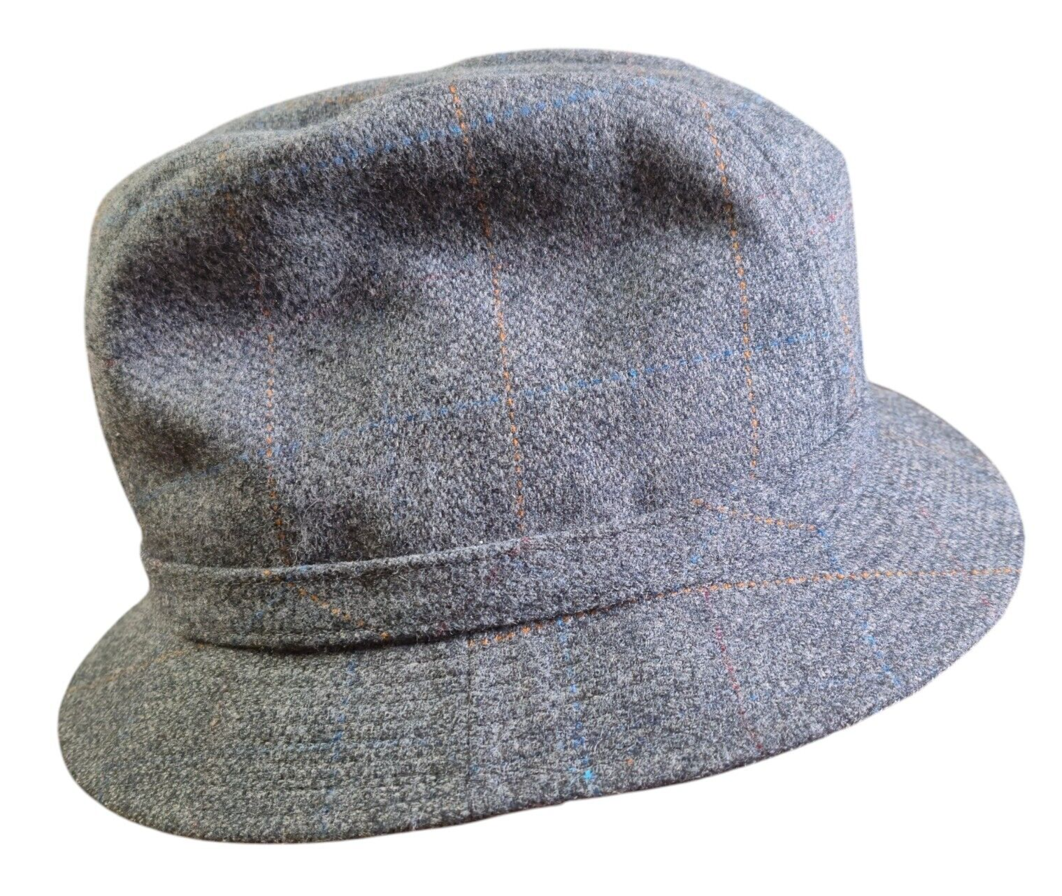 Good condition. This fedora has no rips, tears or stains around the inside rim or outside of the hat. It is in excellent, like-new condition. This hat is a lighter gray with subtle threads of blue and orange throughout. It is a very nice, warm fedora from the 1970s and stylish too.