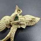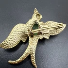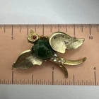 This vintage brooch features a green Jelly Belly bird with a cabochon glass main stone and rhinestone embellishments. The prong setting adds a touch of elegance to this unique piece, making it a perfect accessory for both men and women. With its charming bird theme and vibrant green color, this brooch is sure to add a whimsical touch to any outfit.