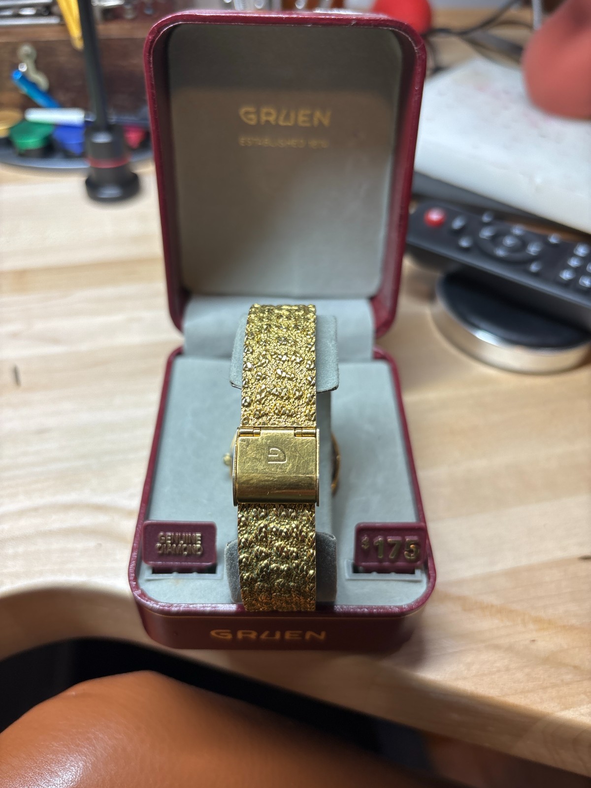 Vintage Gruen Quartz Gold Tone Luxury Watch With Original Gruen Presentation Box Working Condition Offered here is a beautiful vintage Gruen quartz dress watch featuring a gold-tone textured integrated bracelet and a genuine diamond accent at the 12 o’clock position. This watch captures the classic late 1970s / early 1980s luxury aesthetic — elegant, refined, and unmistakably vintage. ✨ Features: • Brand: Gruen • Movement: Quartz (Battery Powered) • Dial: Gold tone with diamond accent at 12 • Case: Gold tone base metal bezel • Case back: Stainless steel • Bracelet: Integrated textured gold tone bracelet • Clasp: Signed Gruen • Includes: Original Gruen box Case back Markings: “Gruen Since 1874” Stainless Steel Back Base Metal Bezel Model: 1250-2036 ⏱ Condition: • Currently running • Keeps time • Crystal is clean • Dial is clean and elegant • Bracelet shows normal light wear consistent with age • Clasp functions properly • Original box shows light storage wear Please review photos carefully as they are part of the description.