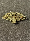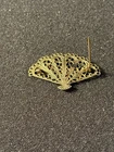 A vintage hand fan shaped costume jewelry brooch or pin, with a filigree design. The brooch is decorated by a bullfighting scene, with a matador facing down a bull. Please see photos. 11/21/25 11/18/25Mapes