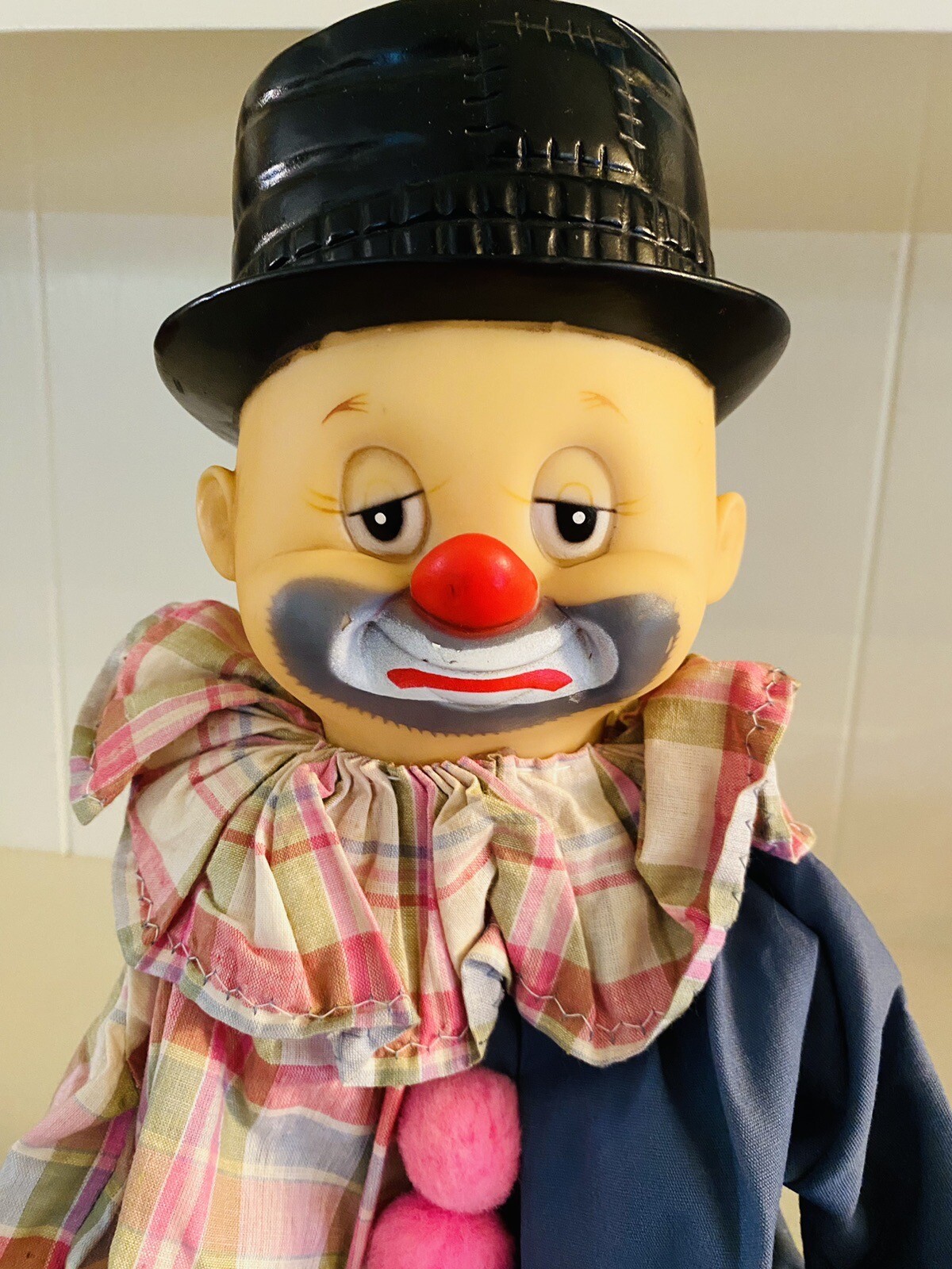 This vintage handmade clown doll is a serious cutie. With a wooden block body, he is made to be a shelf sitter but can sit independently on any surface. He has an adorably retro-looking rubber head, and measures approximately 25” long when fully extended and around 12” tall when seated. A darling doll likely made in the 80s, perfect for any room or display. Feel free to reach out with any questions. I take great care when packaging and ship within one day of purchase. Thank you so much for stopping by! **Please understand this is a vintage and/or used item that may show wear due to age and use. This could include fading, scuffs, scratches, cracks, chips, crazing, marks, nicks, paint/detail loss, etc. Please review all photos before purchasing. All items are sold AS IS.**
