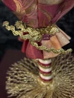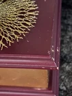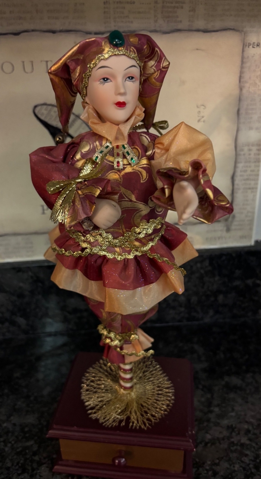 This porcelain harlequin doll is dressed to impress in burgundy and gold, ready to pirouette atop a music box that sings sweeter than your shower voice. • Porcelain doll with intricate hand-painted features • Burgundy & gold detailed outfit • Functional San Francisco music box base • Measures approximately 12 inches tall Has a drawer for Jewlery or stash Minor wear on music box base, no significant flaws on doll or outfit. Please see all photos as they are part of the description. Always open to reasonable offers! Jewelry is never cleaned as we want to preserve its timeless beauty and aging. Vintage items tell a story and we would like you to see that story. It also allows the new owners to clean in a way that is right for them.