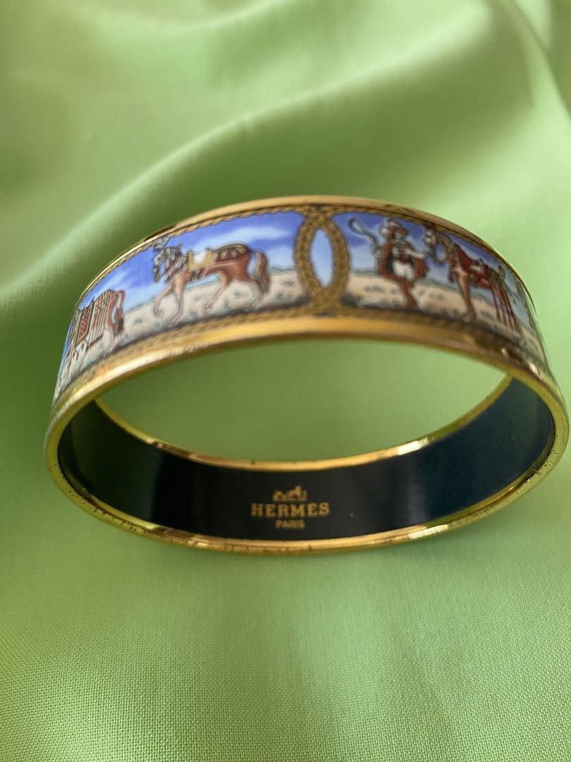 Hermes Vintage Cloisonné Gold Bracelet Excellent Used No Box 50s Style Key Features This vintage Hermès Santaloré bracelet was purchased from the flagship store in Paris in the 1980s. With nearly 50 years of history, its classic design is now rare and no longer available in France or at antique shops. The bracelet features intricate craftsmanship with a refined, elegant style, showcasing Hermès' timeless luxury. It has minor wear, including small paint chips of about 0.5mm, which are barely noticeable. Unlike modern simpler or narrower enamel bracelets, this piece reflects the skilled handiwork of artisans, making it highly valuable. Perfect for pairing with a black sweater for a chic, understated look. Item Specifics: - C:Style: Vintage - C:Type: Bracelet - C:Color: Black - C:Main Stone Color: Not applicable - C:Material: Enamel - C:Metal: Gold-plated - C:Main Stone: None - C:Secondary Stone: None - C:Charm Type Specifications Brand HERMES Country Japan Product Description Item Title Hermes Bracelet Vintage Cloisonne Ware/Gold Used Payment Supports managed payments Please pay within 5 days after auction is finished. About Us We are located in Japan. It's our pleasure to make you happy by proposing our recommend item. If you have any questions or request about items, please feel free to ask us. International Buyers - Please Note: -Import duties, taxes, and charges are not included in the item price or shipping charges. These charges are the buyer's responsibility. -Please check with your country's customs office to determine what these additional costs will be prior to bidding/buying. -These charges are normally collected by the delivering freight (shipping) company or when you pick the item up - do not confuse them for additional shipping charges. -We do not mark merchandise values below value or mark items as - gifts - The US and International government regulations prohibit such behavior. Thank you for your understanding.