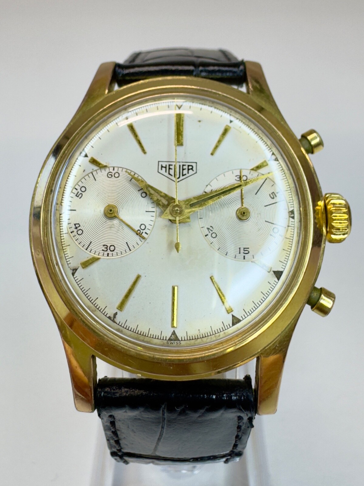 HEUER CHRONOGRAPH PRE-CARRERA BIG EYES AYRTON SENNA’S WATCH This Heuer Chronograph Pre-Carrera , nicknamed Big Eyes , from the 1960s is the legendary model that inspired the iconic TAG Heuer Carrera . It is powered by the Valjoux 23 movement , a hand-wound mechanical caliber renowned for its reliability and robustness—one of the most respected and sought-after movements in watchmaking. With its 20-micron gold-plated case , leather strap , and gold-tone buckle , this watch boasts a timeless and elegant style.