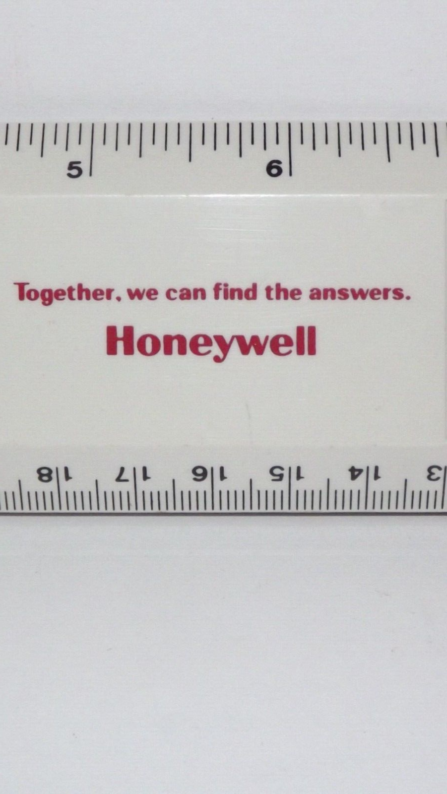 Vintage Calcuruler with Honeywell advertising stamp in middle. Box model number 6312, made in Taiwan unknown copyright date. Combination of 12 inch ruler on one edge, centimeters on other digital clock and calculator also includes conversion chart. Untested exact working condition is unknown. Did not take back off uncertain if it is battery powered or other. Instruction paper is missing. Ruler is clean no cracks splits breaks or repairs clock section has original plastic cover over it. Black numbers are bold no fading. Box has a few age and storage imperfections that include light scratches, scuffs, spots rubbing bad spots along edges and corners, end flaps have a slight warp and a couple small rips. As stated above calculator and clock are untested exact working condition is unknown. Please look at pictures and use the zoom feature for more of an up close view. This is an "as is" listing and I will not accept any returns, sorry for any inconvenience. Shipped for free international rates apply. Any questions or to request more detailed pictures please message me I do respond quickly!!